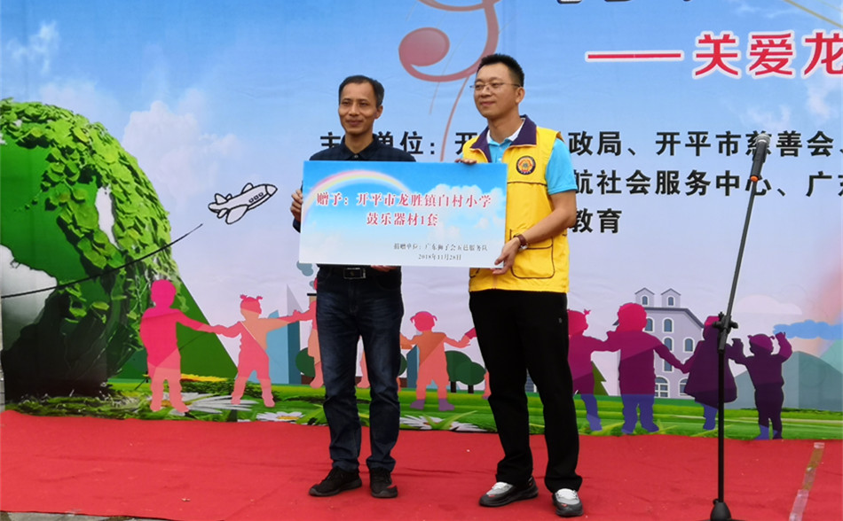 在活动现场,广东狮子会五邑服务队向学校赠送了一批鼓乐器材和电脑设备。学生代表现场表演了鼓乐操,用自己的学习成果来感谢热心团队的关心与支持。此外,活动现场还通过简洁的授旗仪式,成立了“友伴‘童’行”义工服务队。