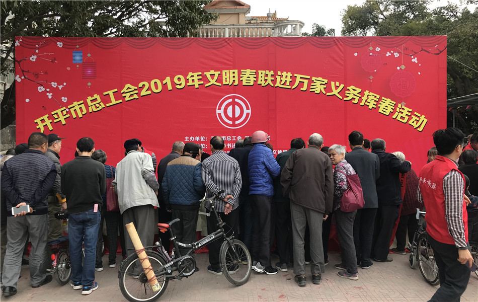 这次活动由开平市总工会和市文联联合举办,以义务写春联、送春联的形式,为广大市民群众送上新年的美好祝福,进一步弘扬中华传统文化,营造喜庆祥和的节日氛围。