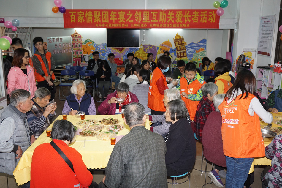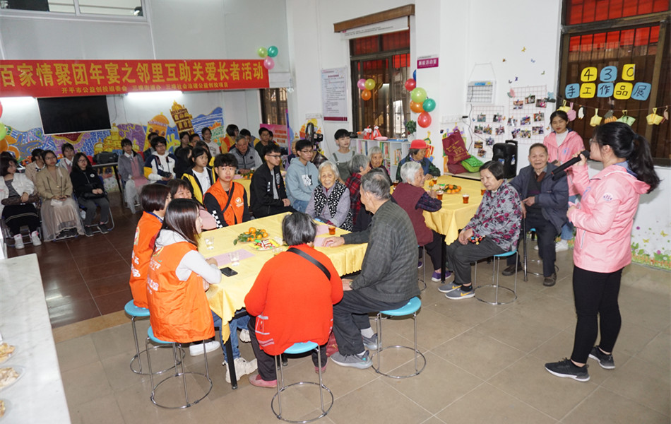 2月1日上午,开平市三埠街道社会治理公益创投项目祥龙站组织党员义工、社工、学生义工到三埠老友记幸福饭堂为26名长者举办团年宴会,以载歌载舞的形式给长者营造欢乐气氛。
