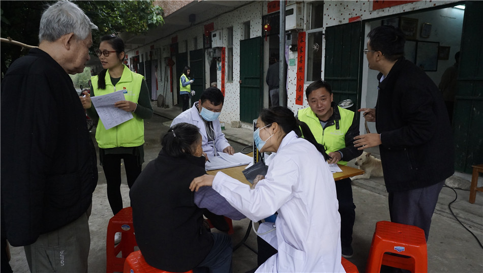 2月27日上午,开平市蚬冈镇卫生院联同市第二人民医院到玲珑新村开展国家基本公共卫生服务项目义诊活动,为老人送健康。