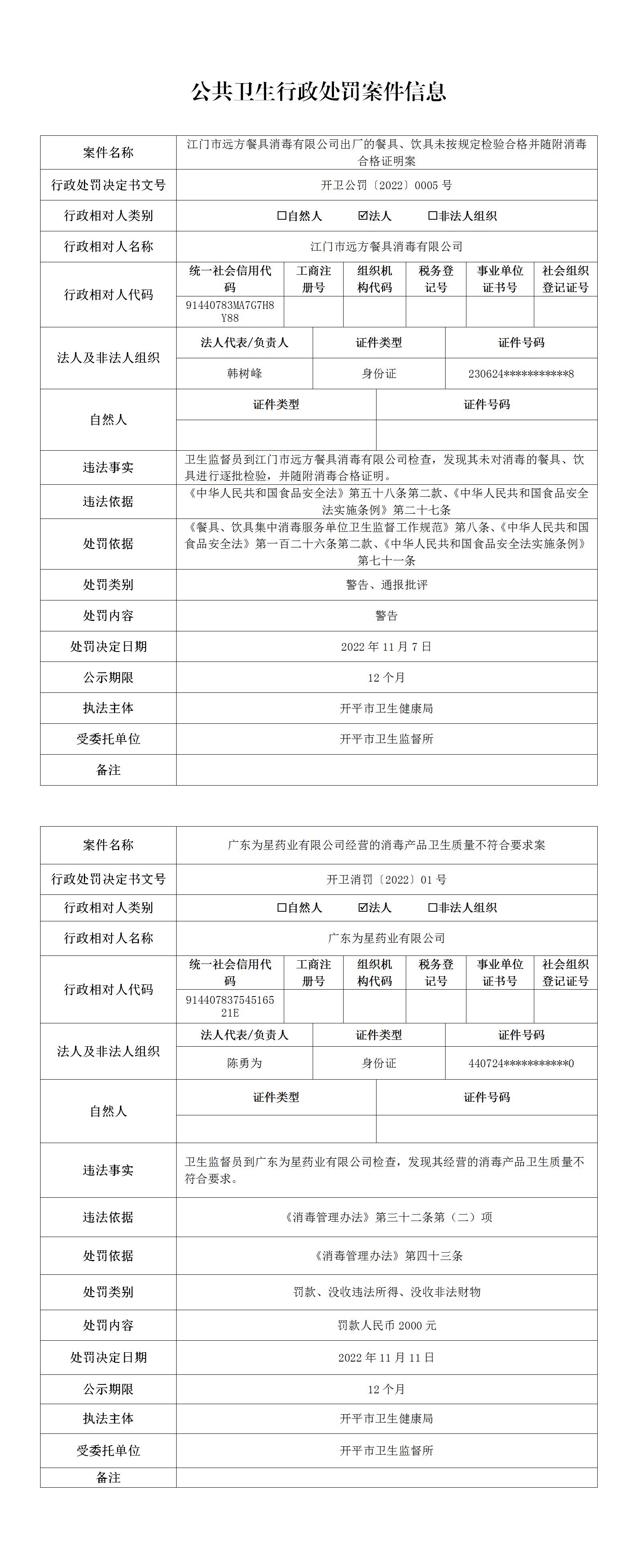 公共卫生行政处罚案件信息(2022年11月14日)
