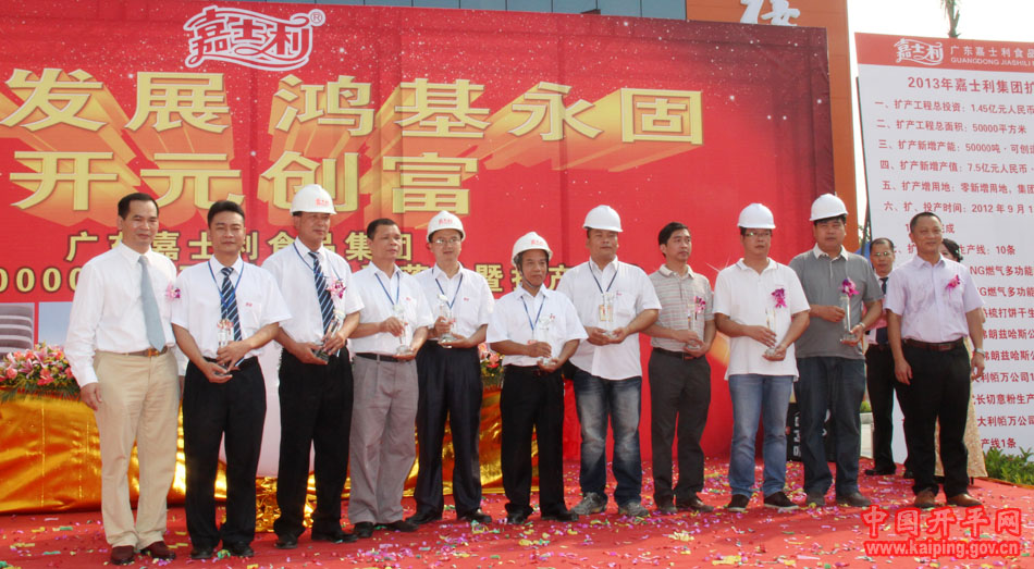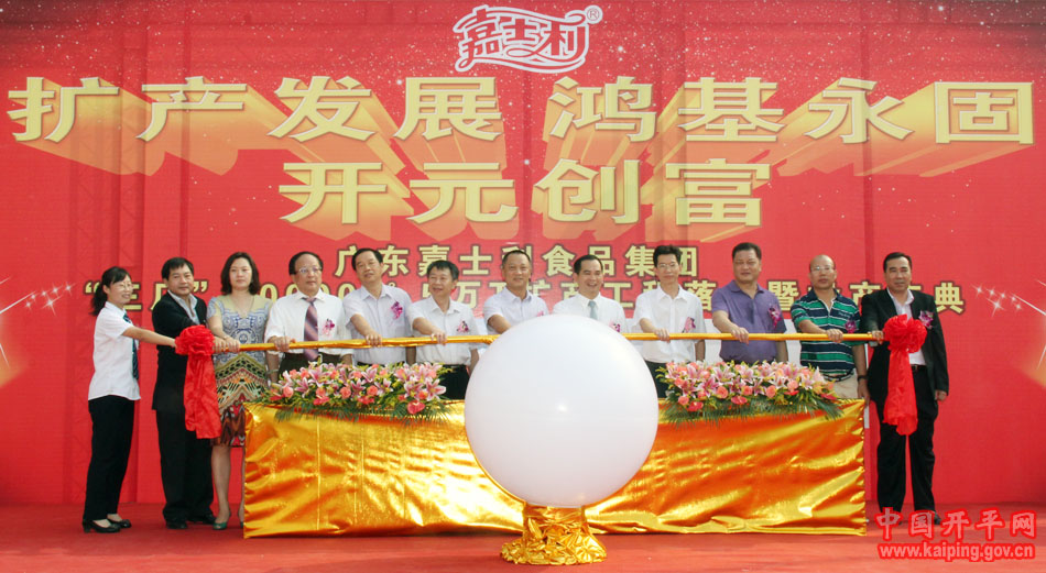 10月10日上午,广东嘉士利食品集团在开平总部举行5万平方米厂房、5万吨扩产工程落成投产庆典。江门市发改局局长潘创明,开平市领导文彦、张星杰、朱金治、吴年积、梁和平及相关部门领导出席了庆典活动。