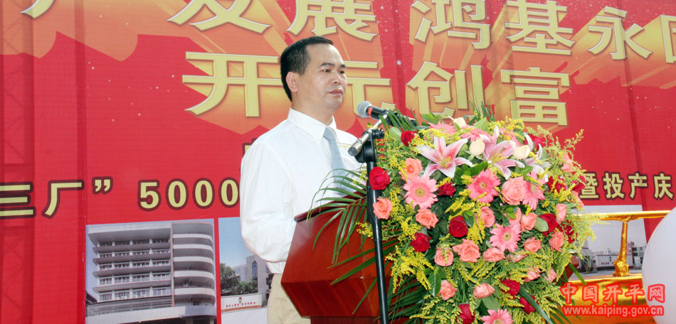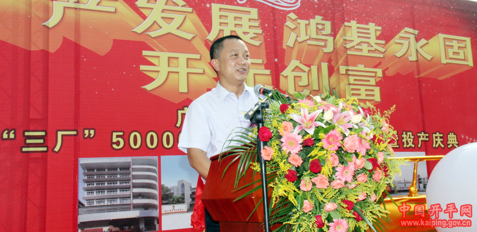 开平市市长文彦致辞时指出:嘉士利集团扩产工程由奠基到投产仅仅用了十三个月,这种速度表现了嘉士利人只争朝夕,全心投入事业的精神。该项目也是我们江门、开平市“零用地”增资扩产的代表性项目,为我市各类型企业结合实际,通过增资扩产实现可持续发展起到良好的示范作用。