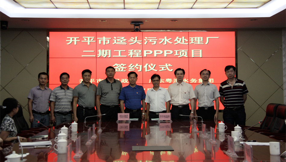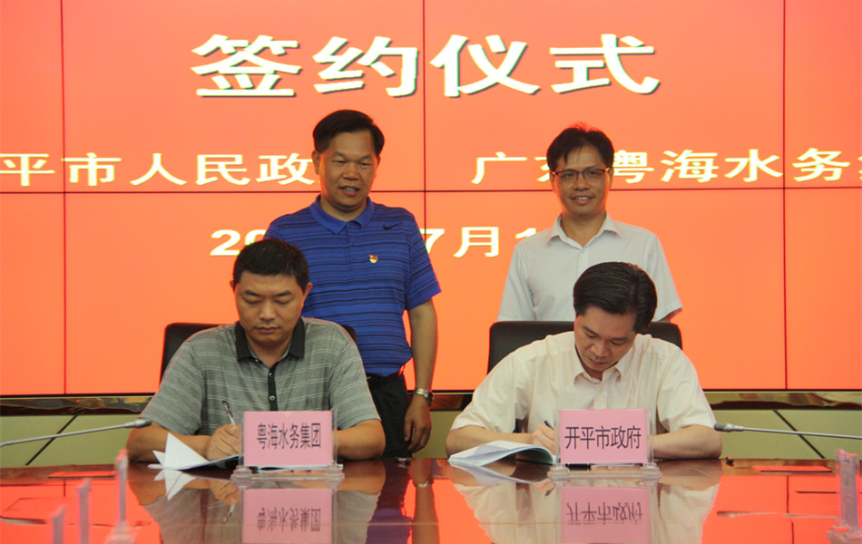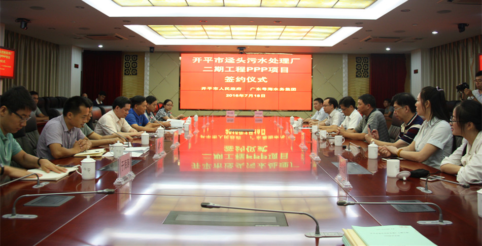 7月18日下午,开平市举行迳头污水处理厂二期工程PPP项目签约仪式,开平市副市长黄国忠,开平市水务局局长谭永雄,副局长黄清洲,财政局、环保局、污水处理中心有关领导,以及粤海水务集团副总经理刘梅盛、开平粤海水务董事长易孝军等出席签约仪式。