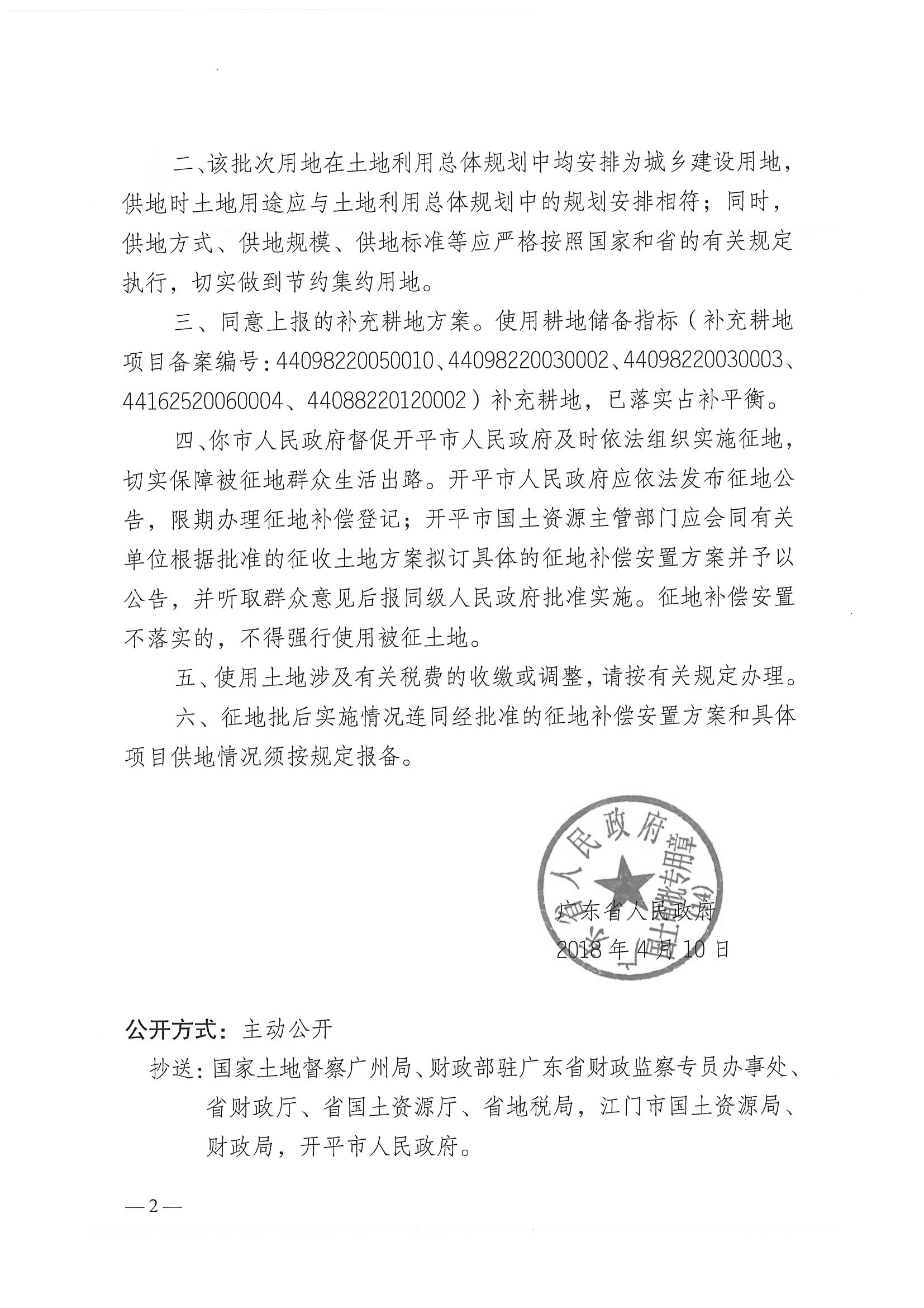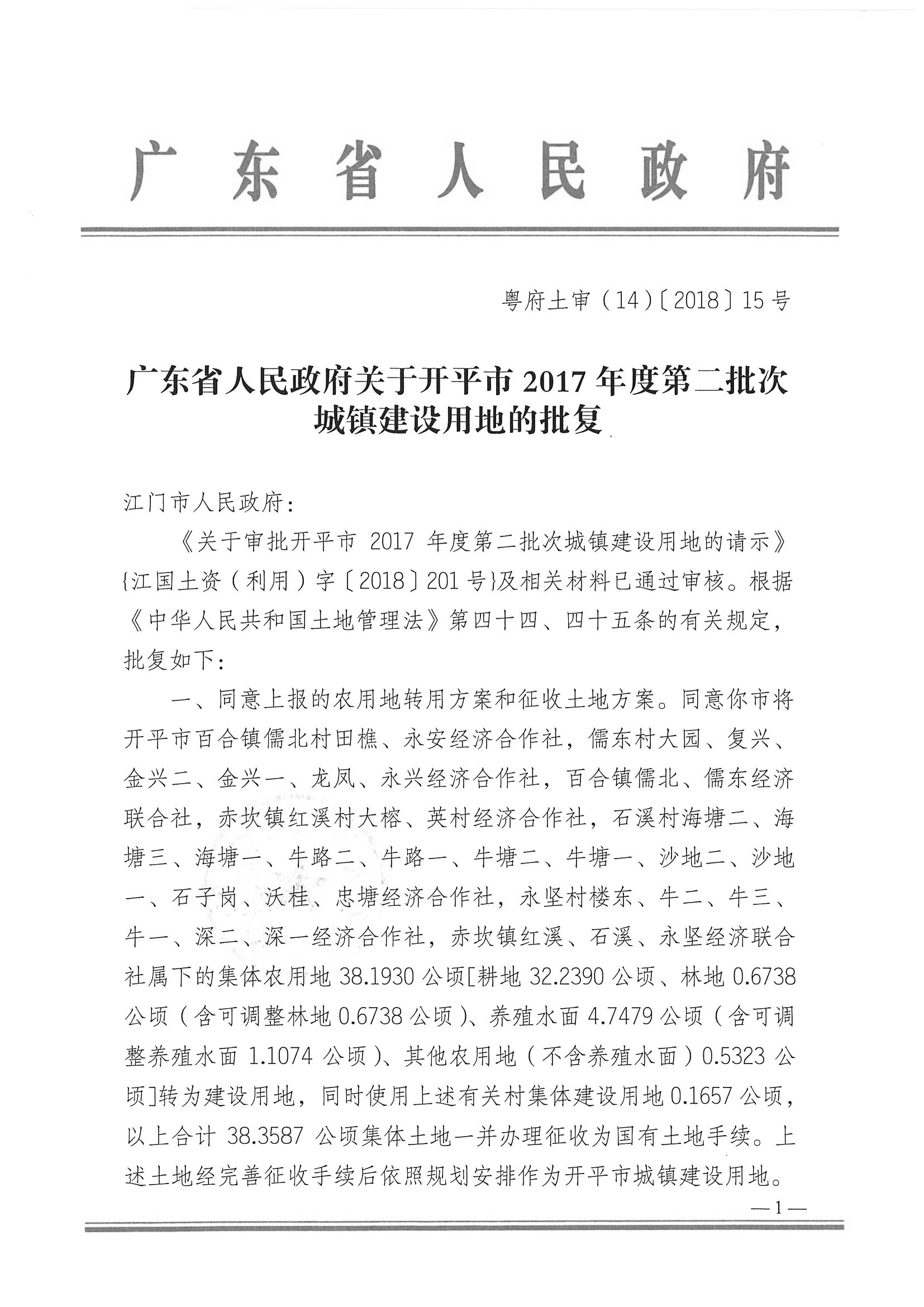 广东省人民政府关于开平市2017年度第二批次城镇建设用地的批复