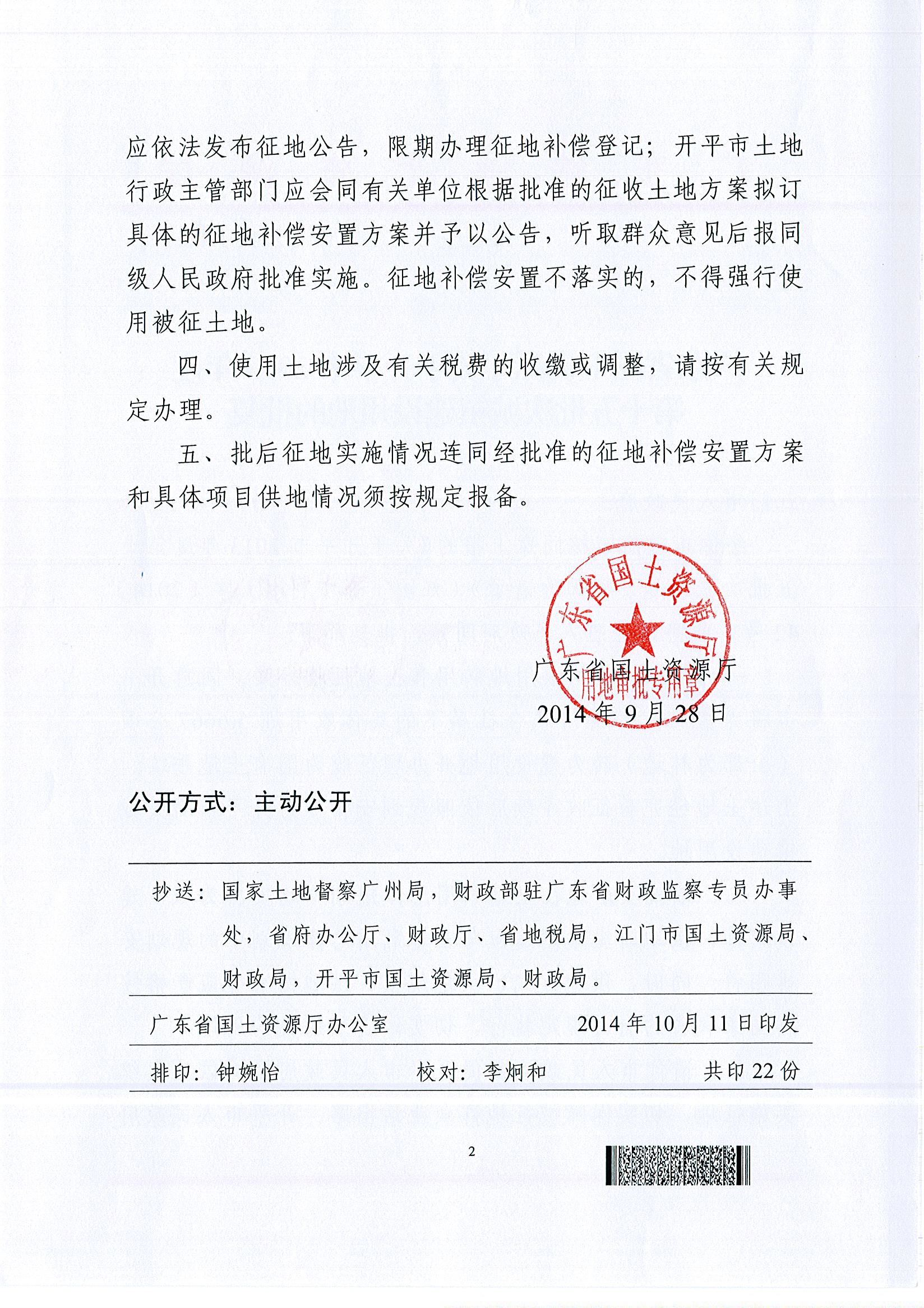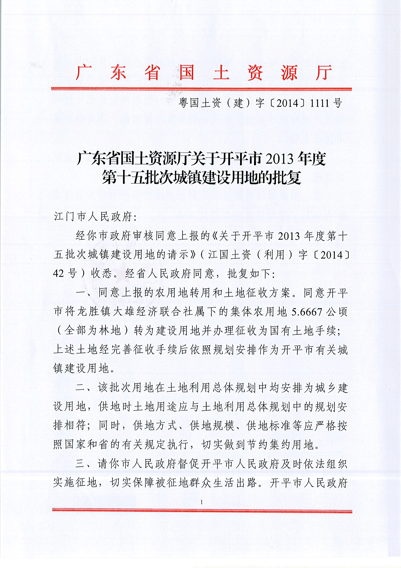 开平市2013年度第十五批次城镇建设用地的批复