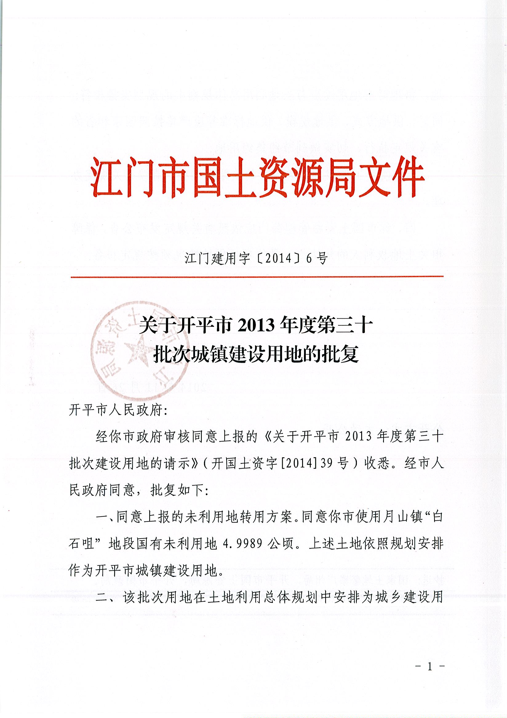 开平市2013年度第三十批次城镇建设用地的批复