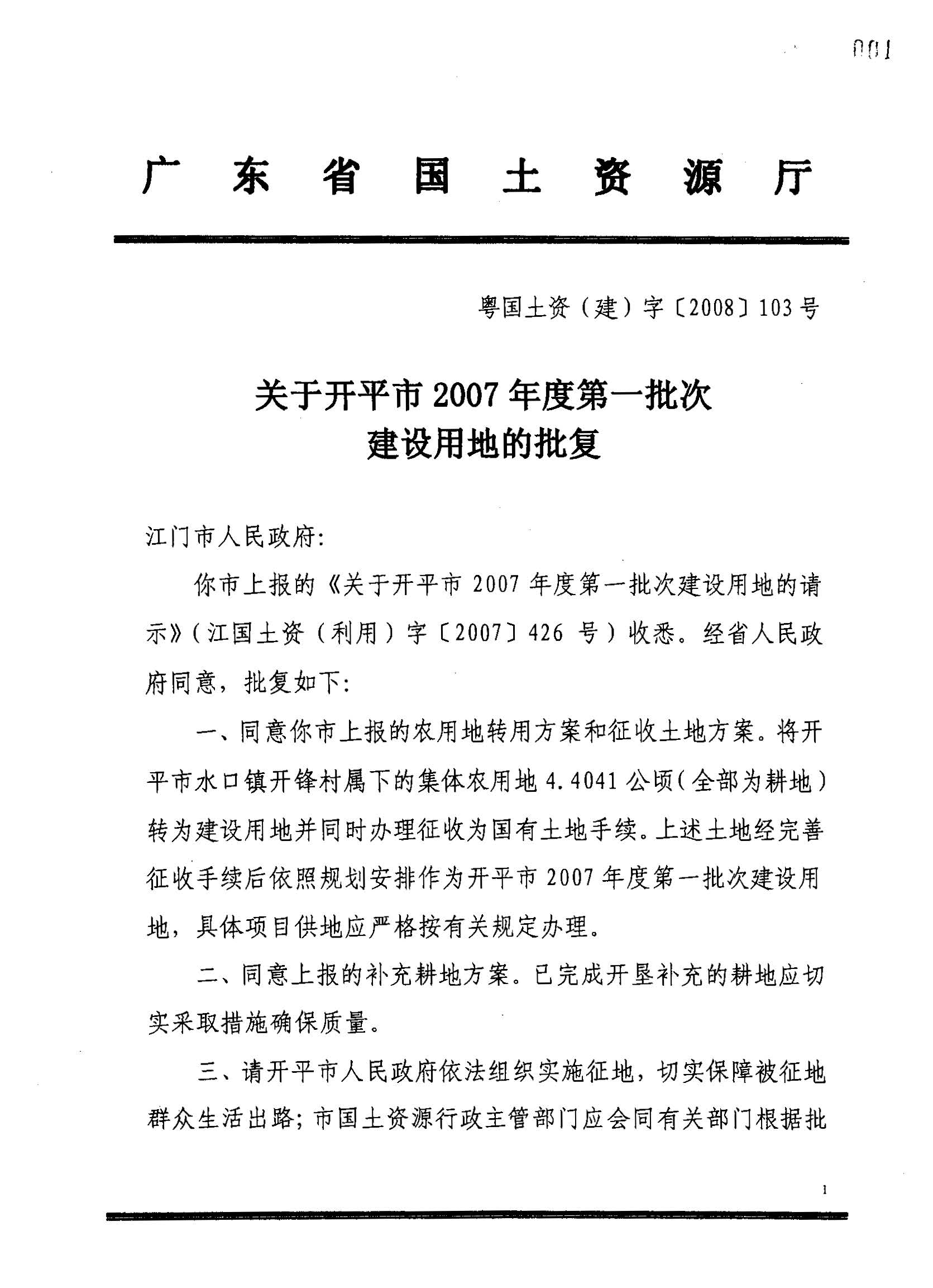 开平市2007年度第一批次建设用地的批复