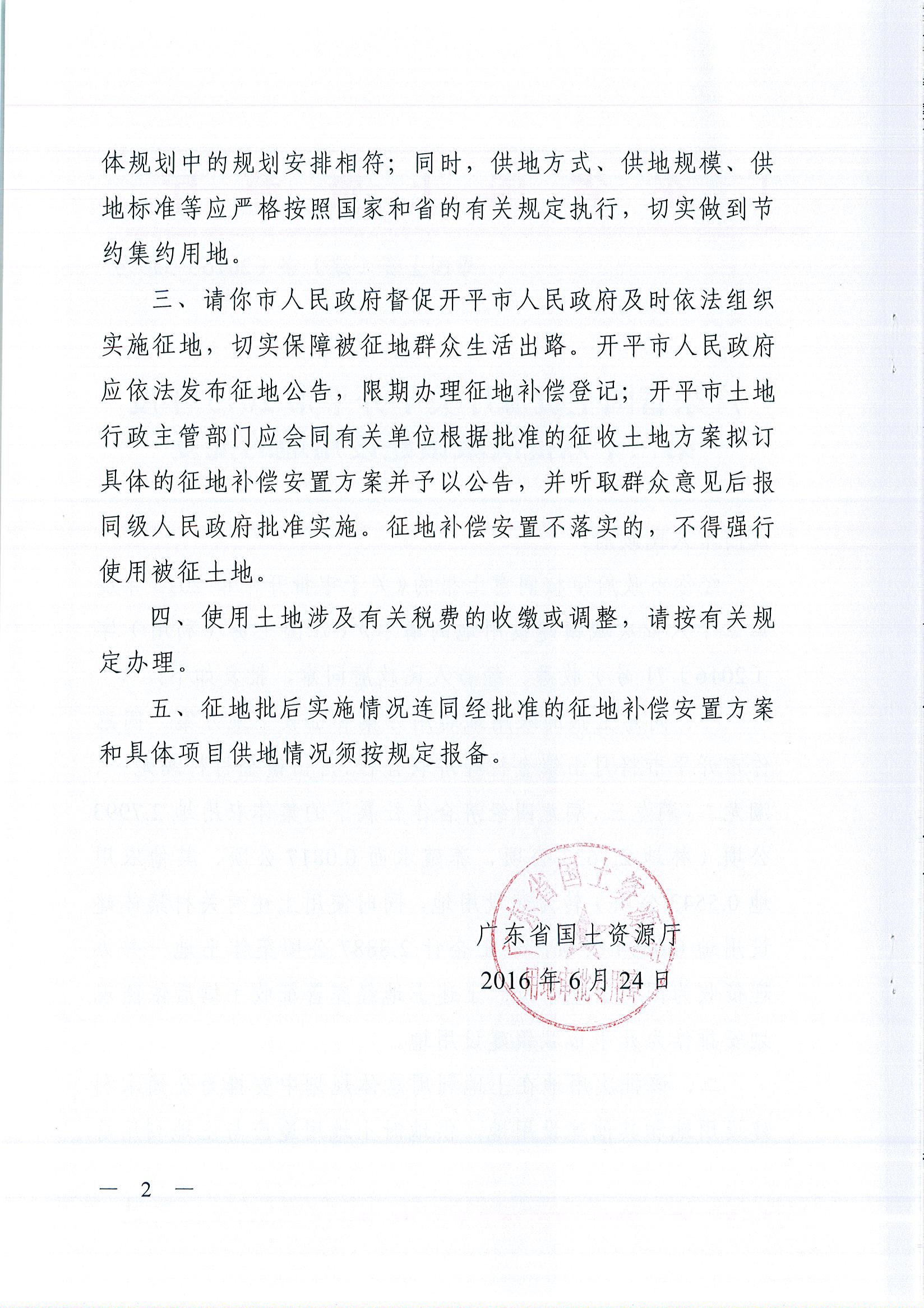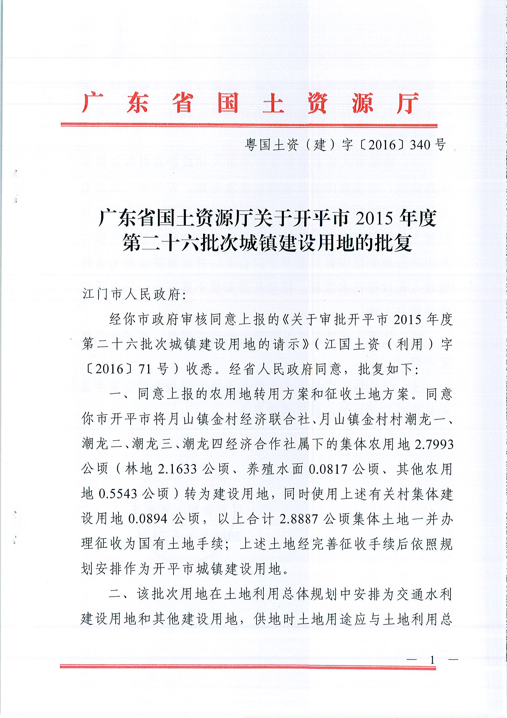 广东省国土资源厅关于开平市2015年度第二十六批次城镇建设用地的批复