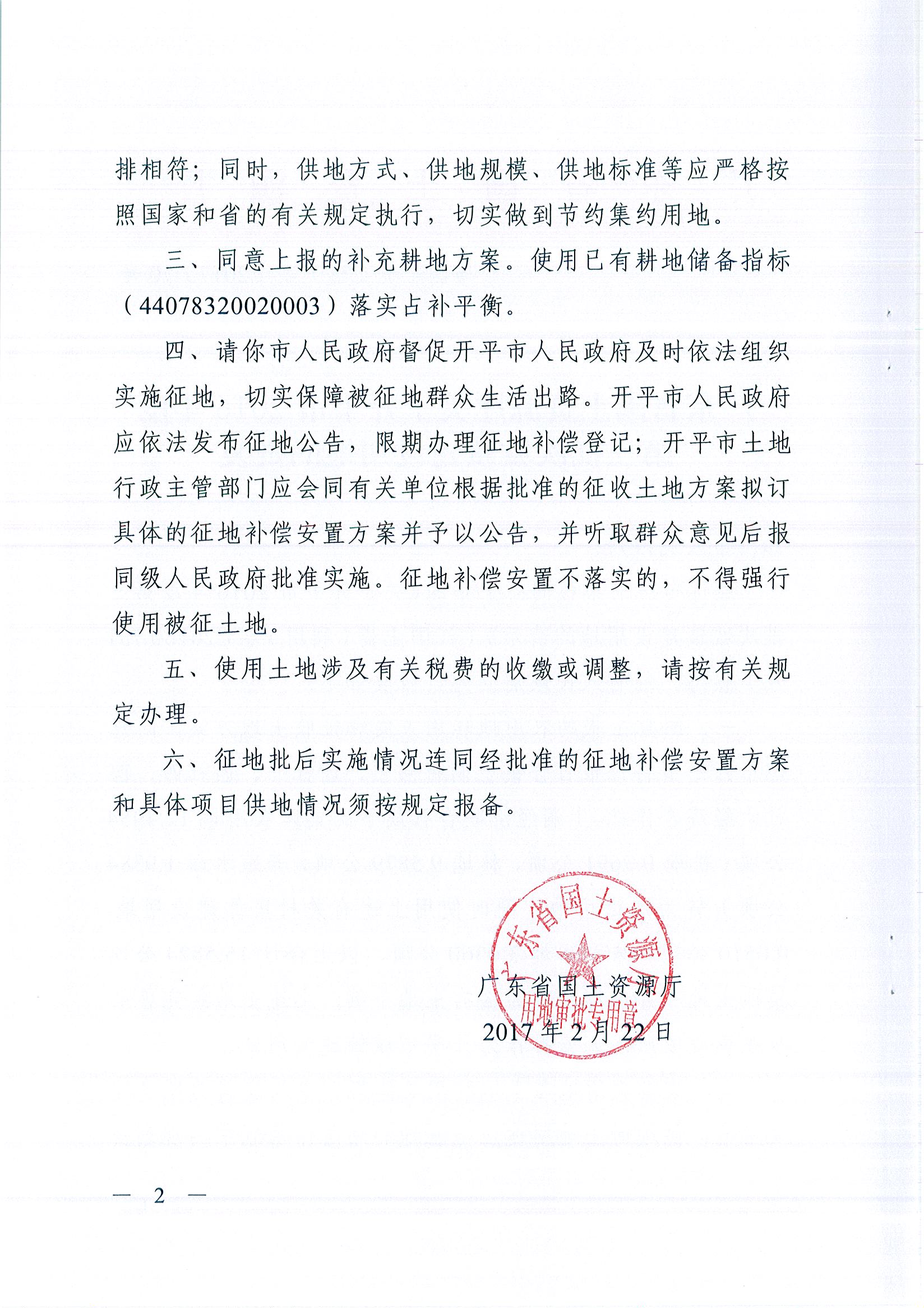 广东省国土资源厅关于开平市2016年度第三批次城镇建设用地的批复