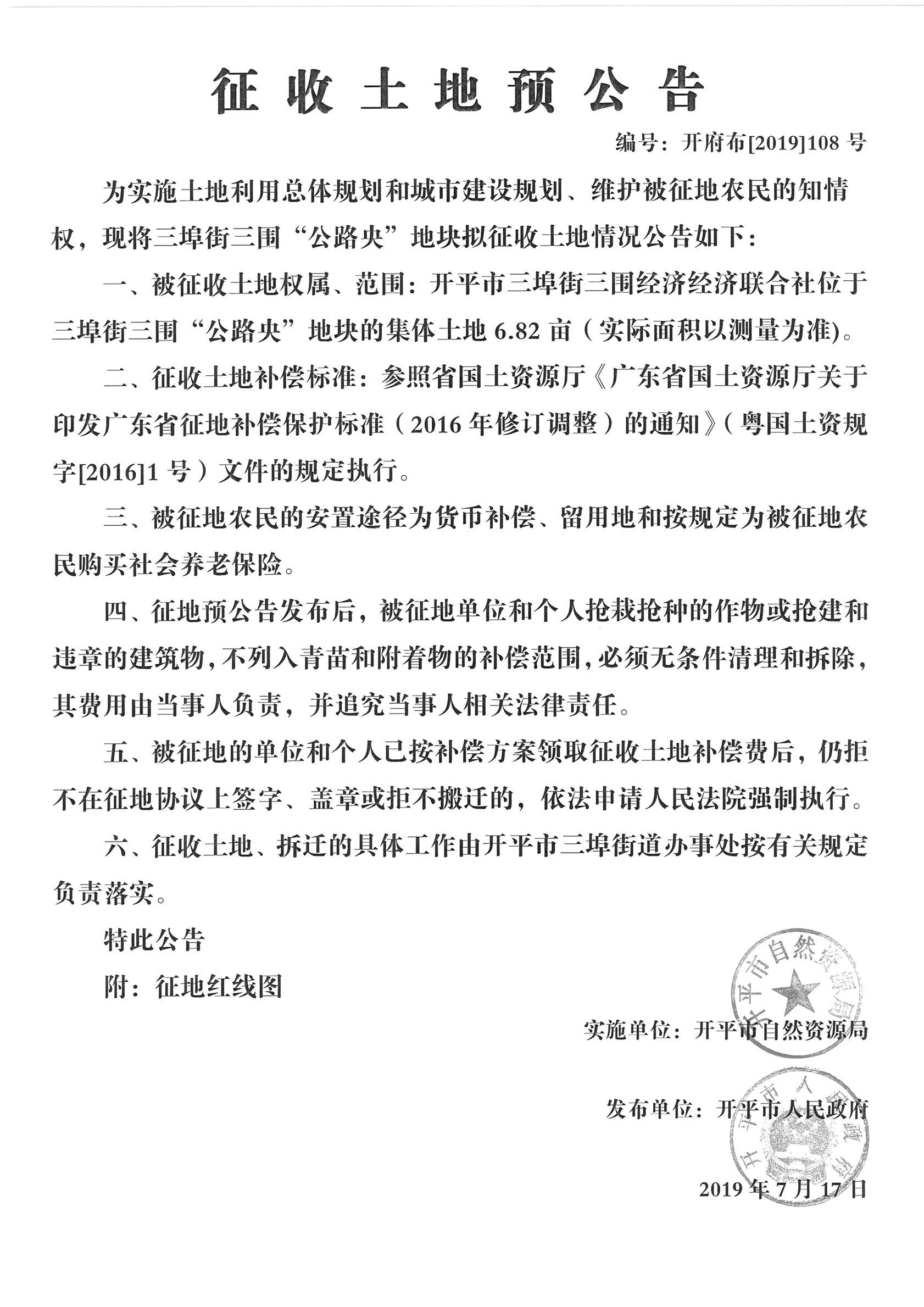 三埠街三围“公路央”地块征收土地预公告