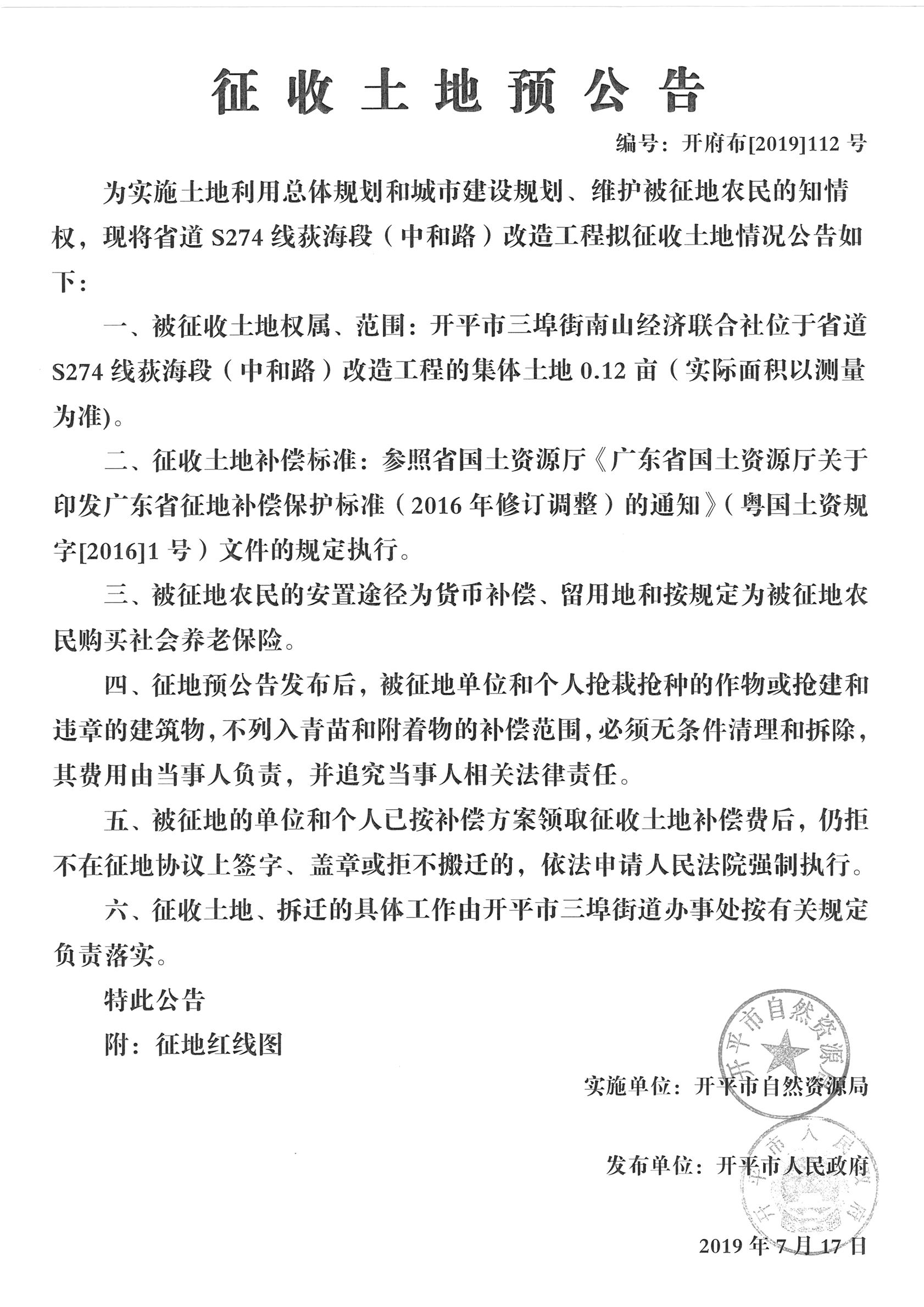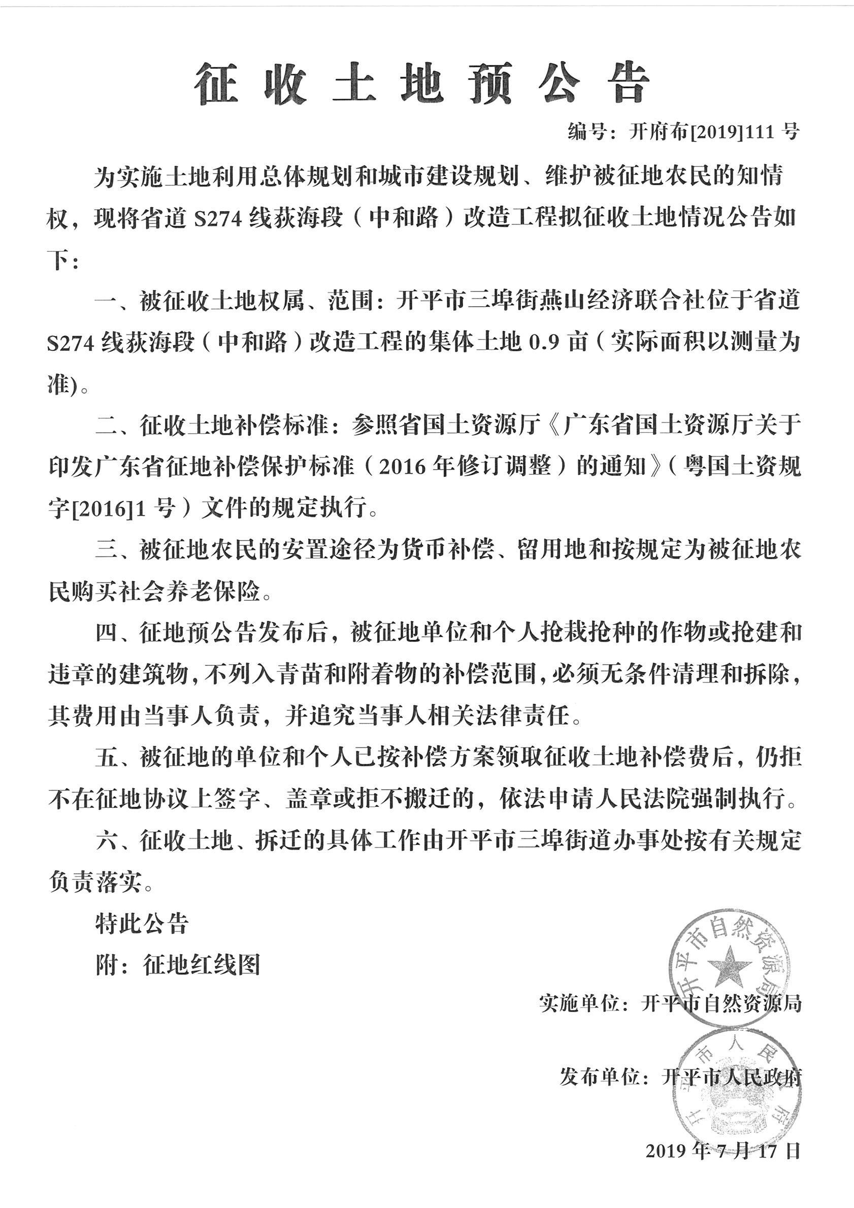 省道S274线荻海段(中和路)改造工程征收土地预公告