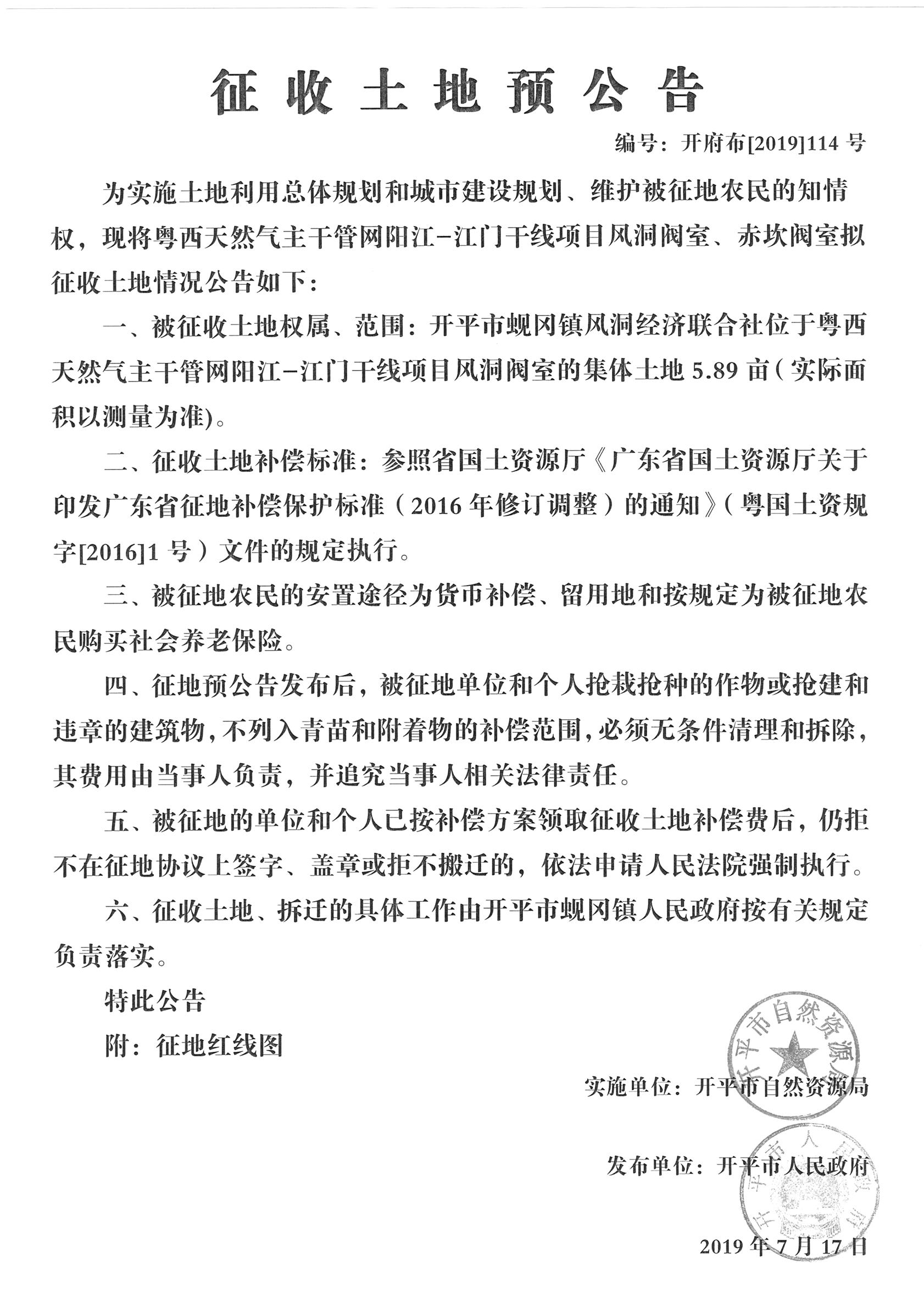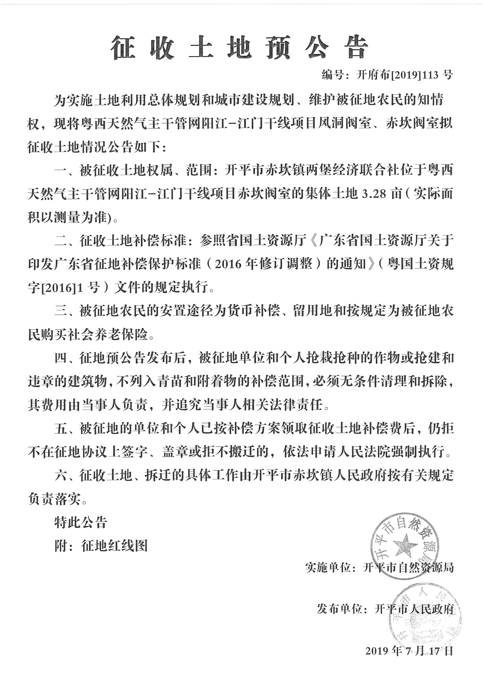 粤西天然气主管网-江门干线项目风洞阀室、赤坎阀室征收土地预公告
