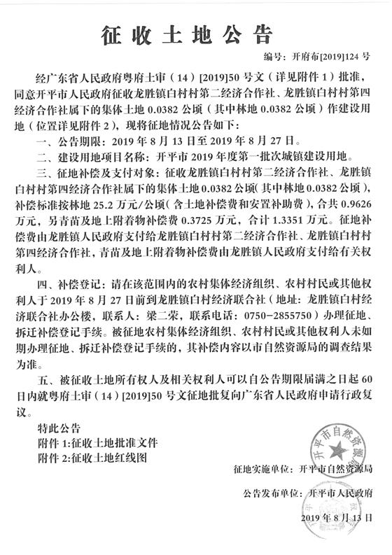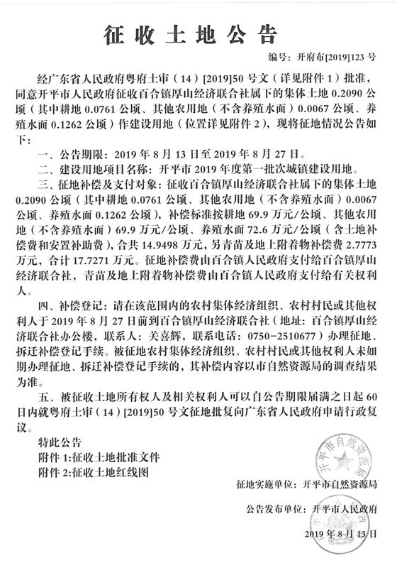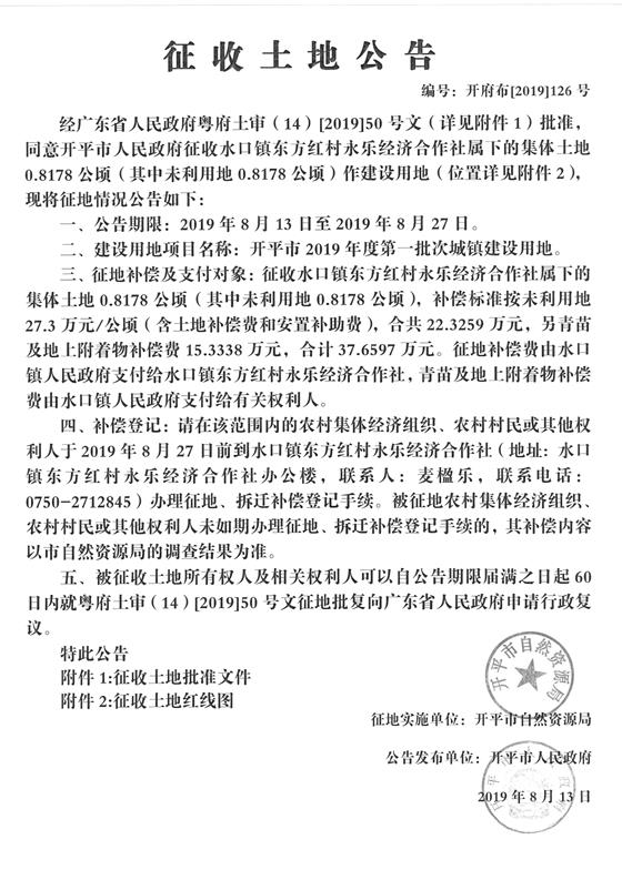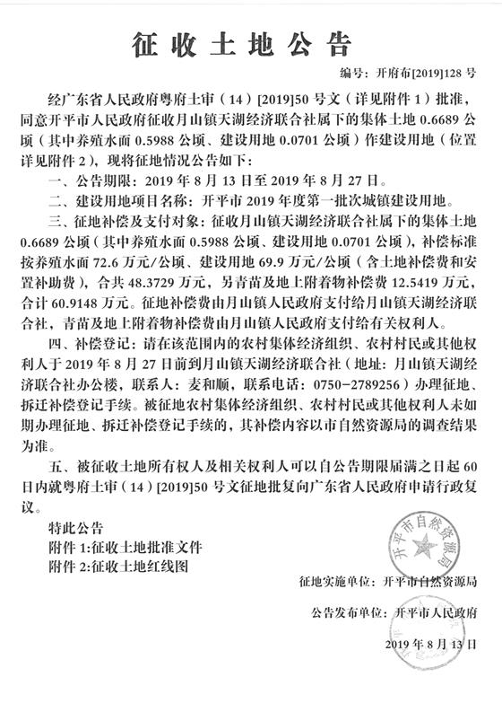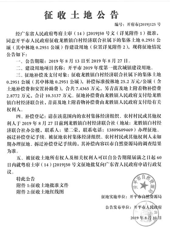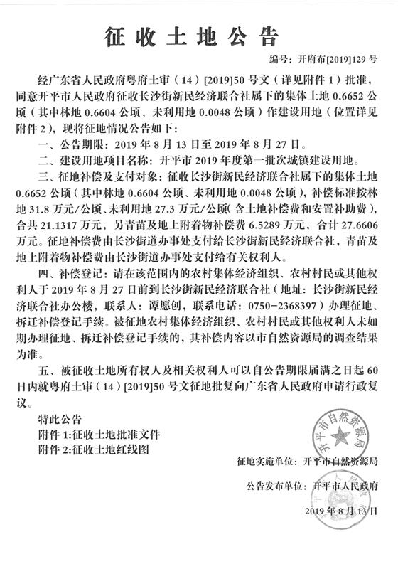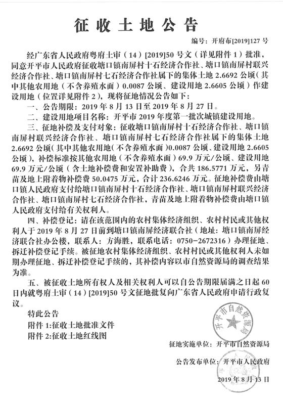 征收土地公告(开平市2019年度第一批次城镇建设用地)2