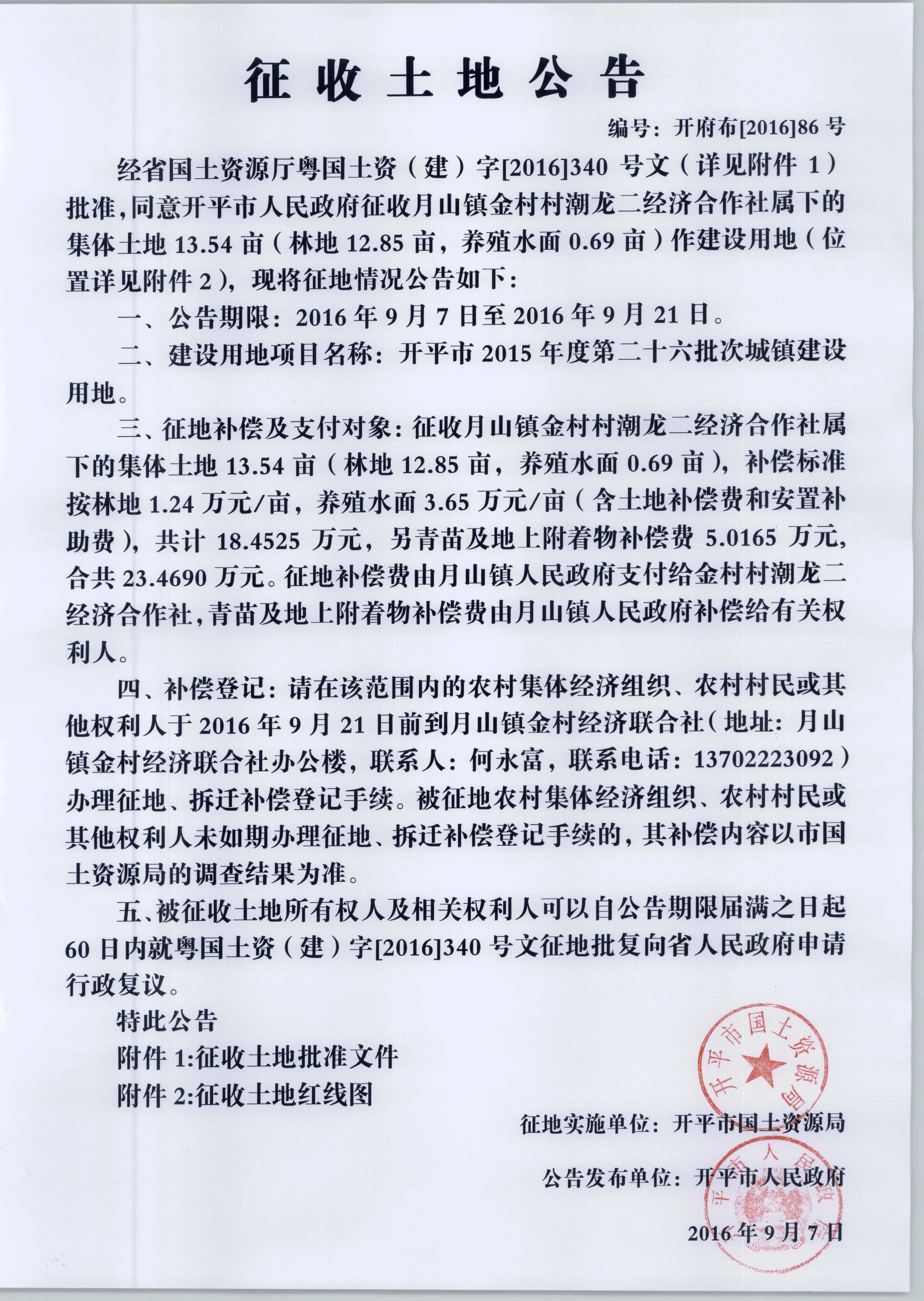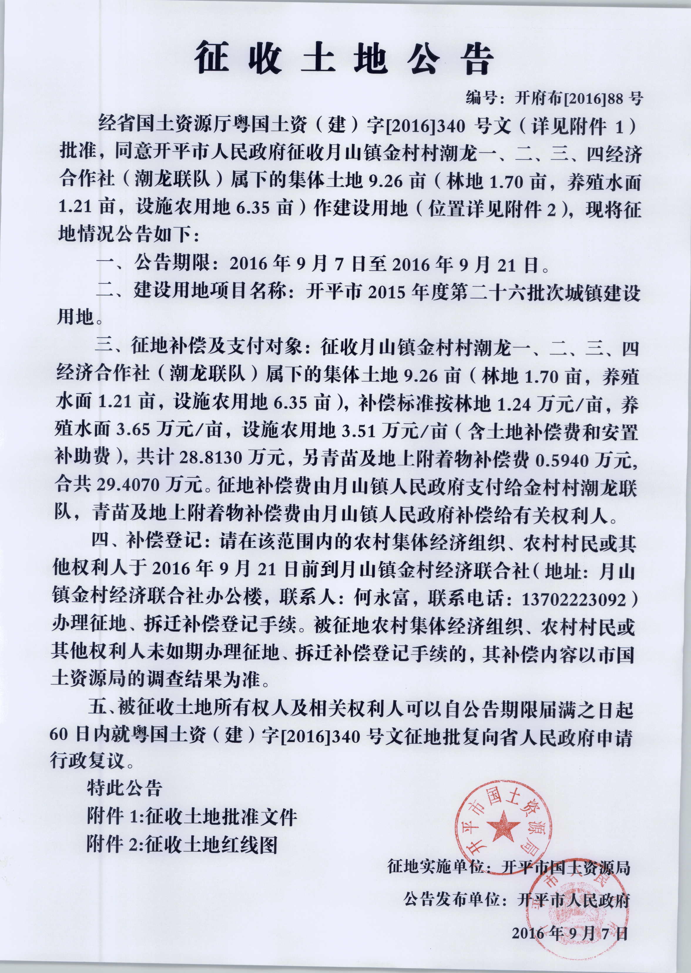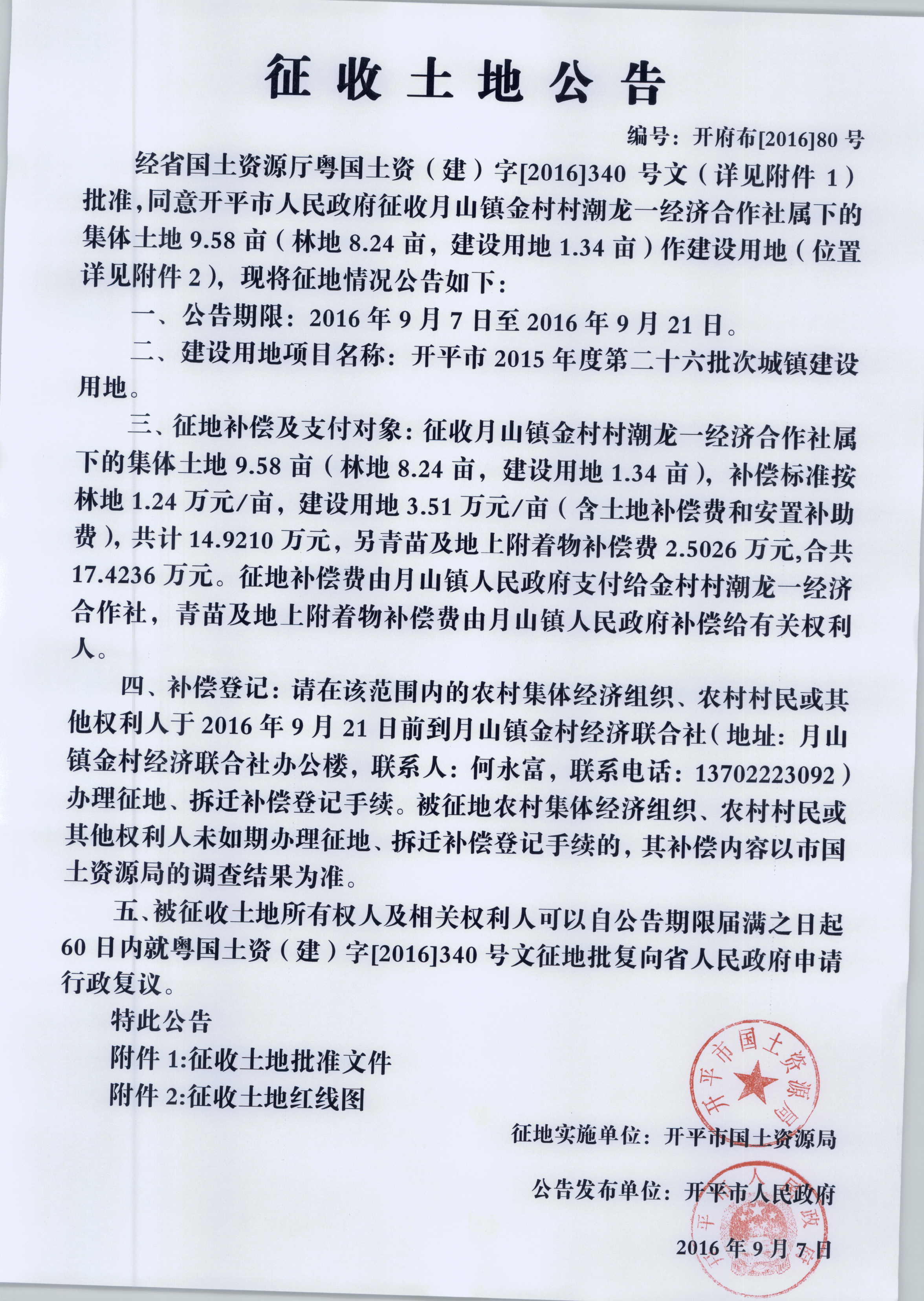 征收土地公告(开平市2015年度第二十六批次城镇建设用地)