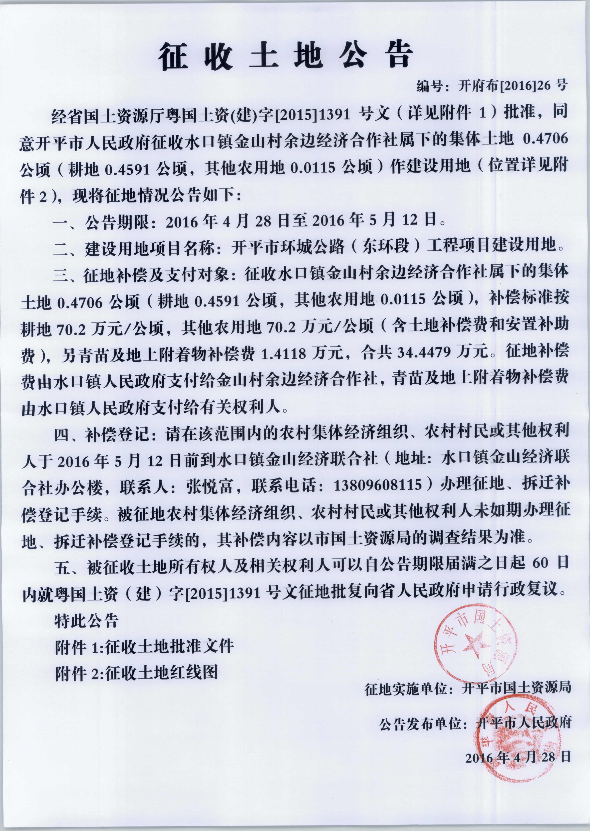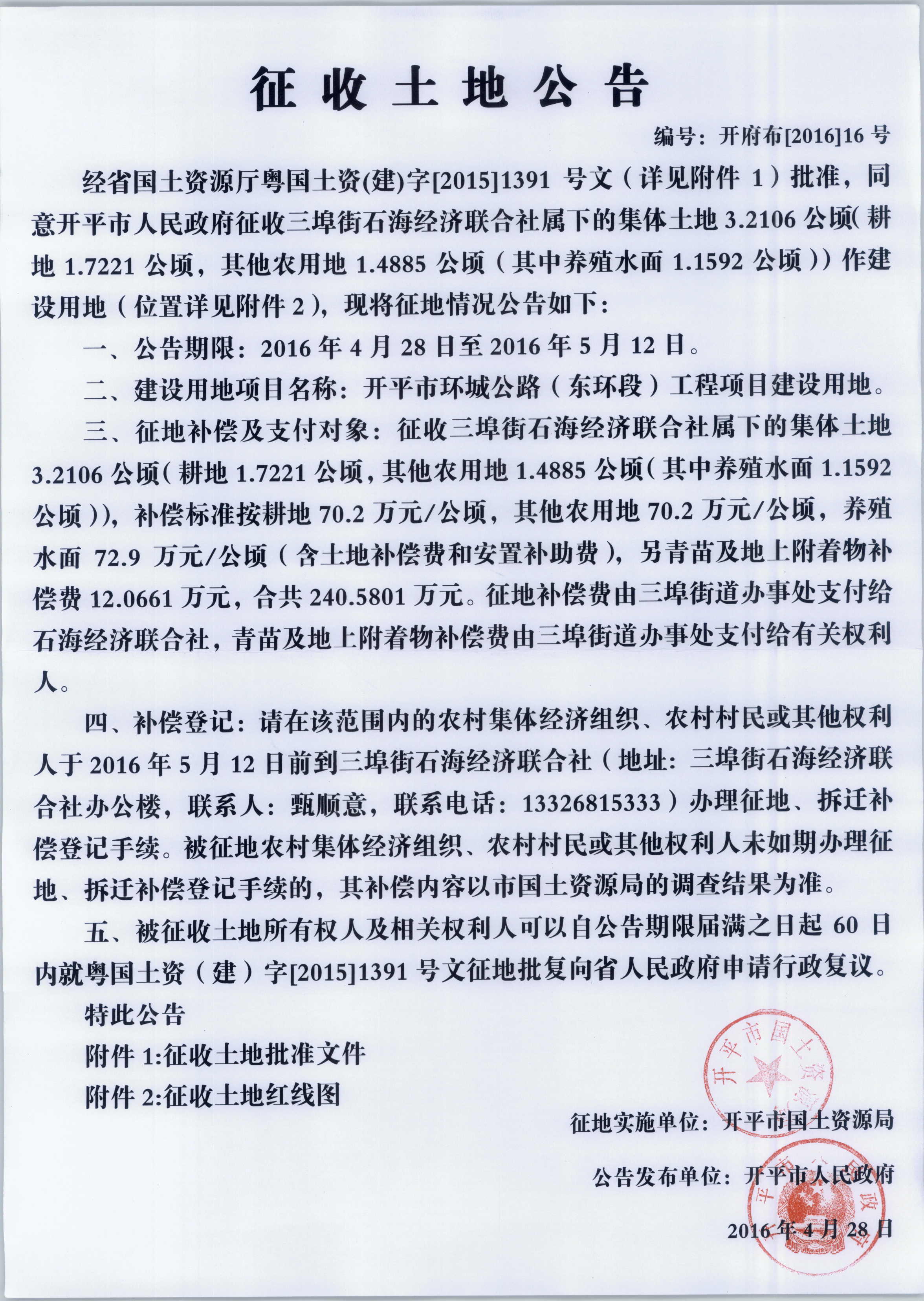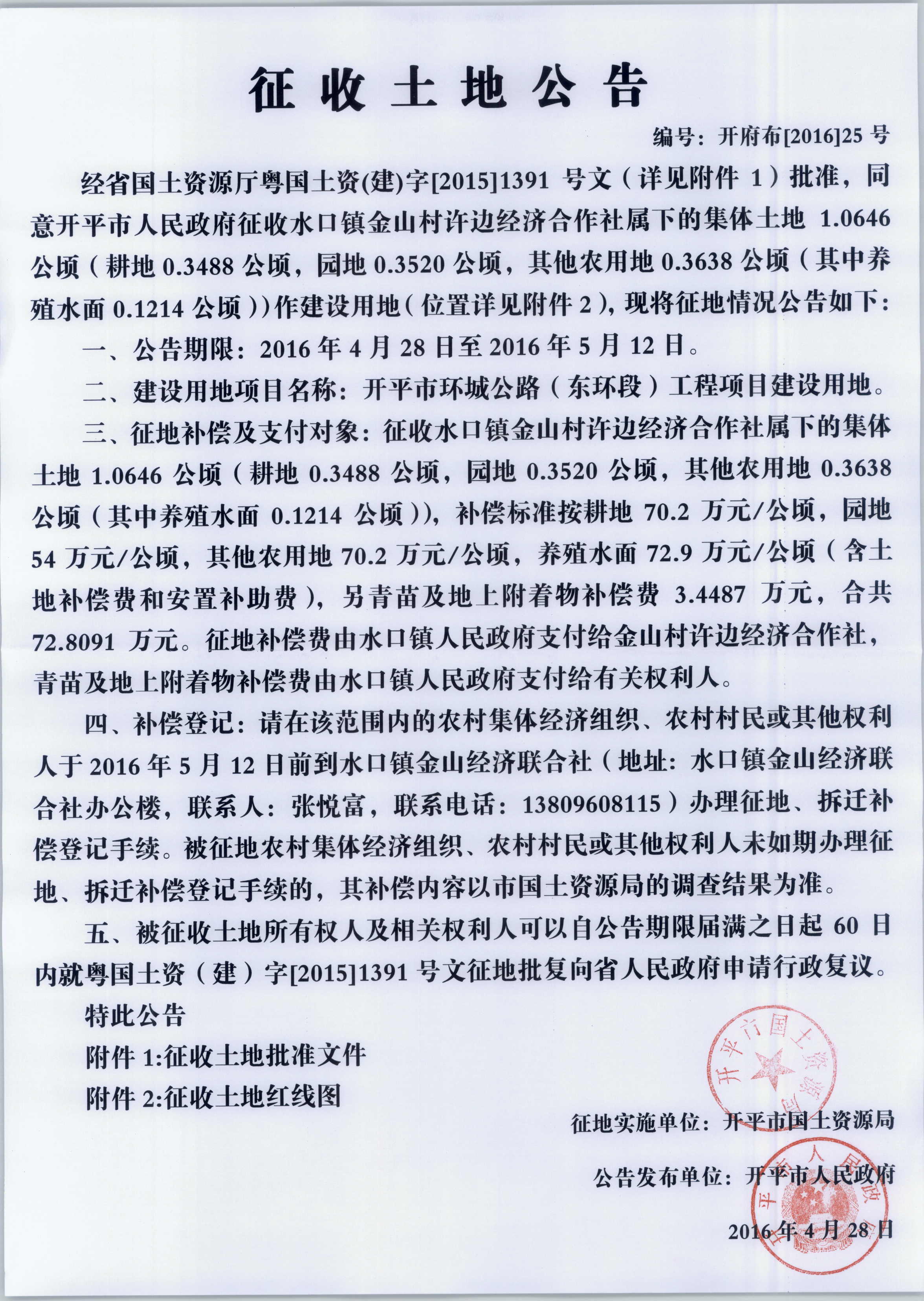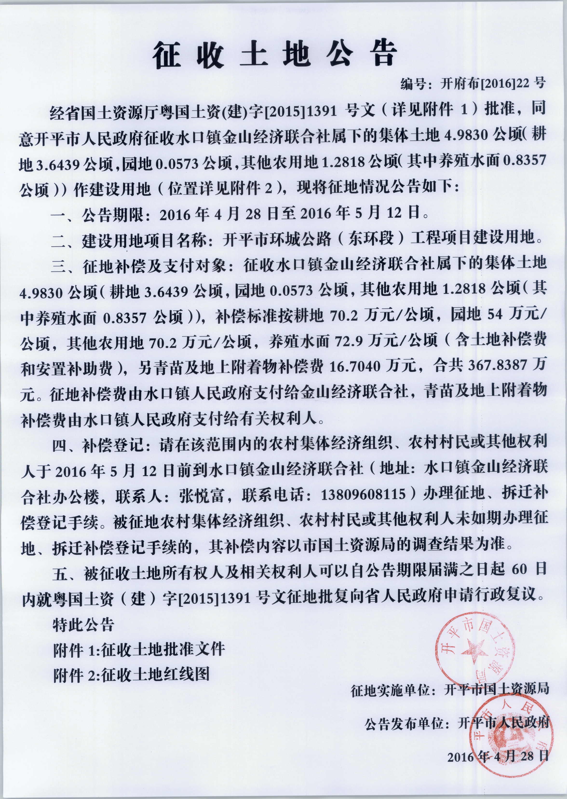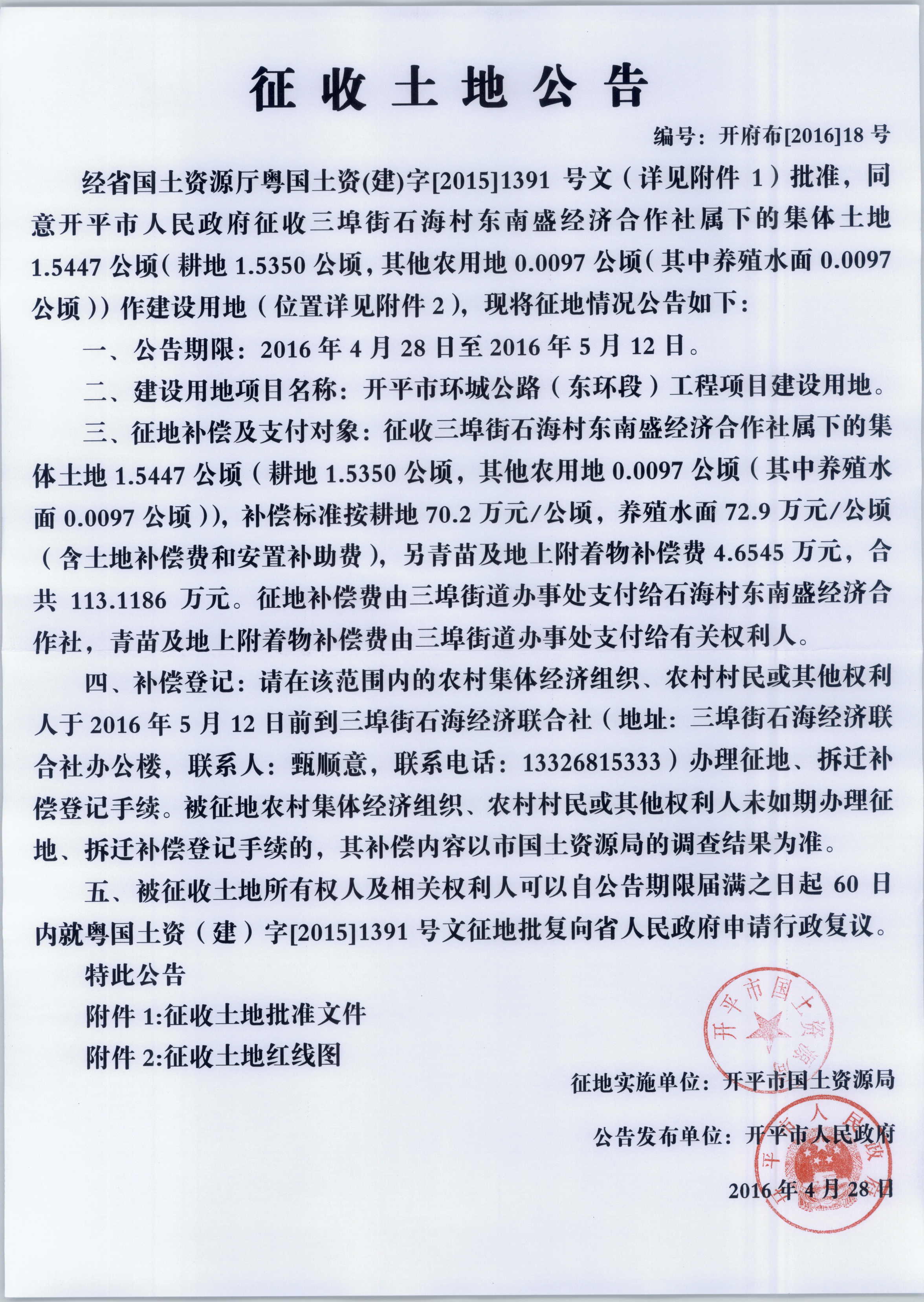 征收土地公告(开平市环城公路(东环段)工程项目建设用地)