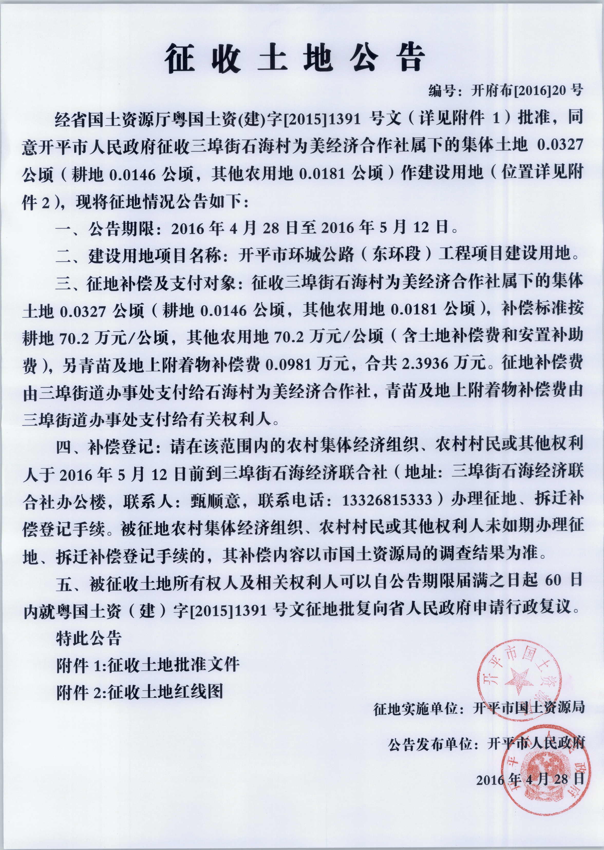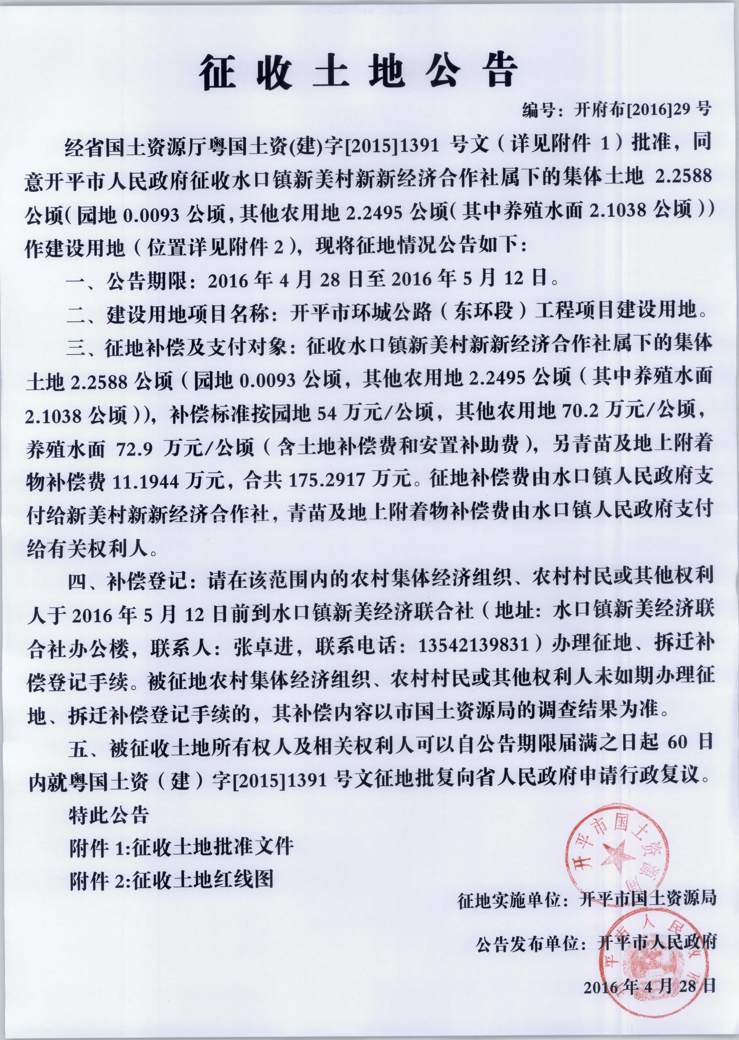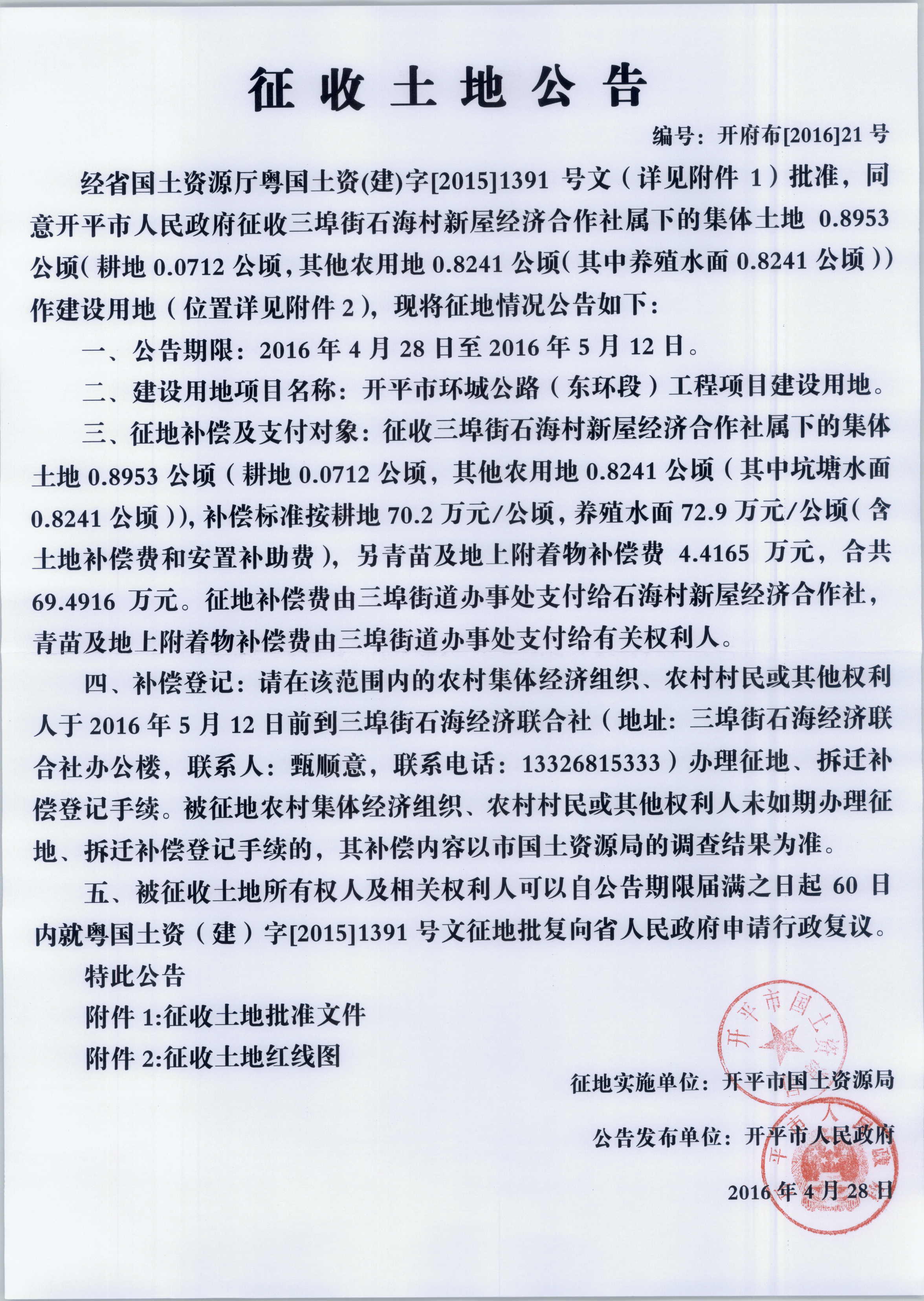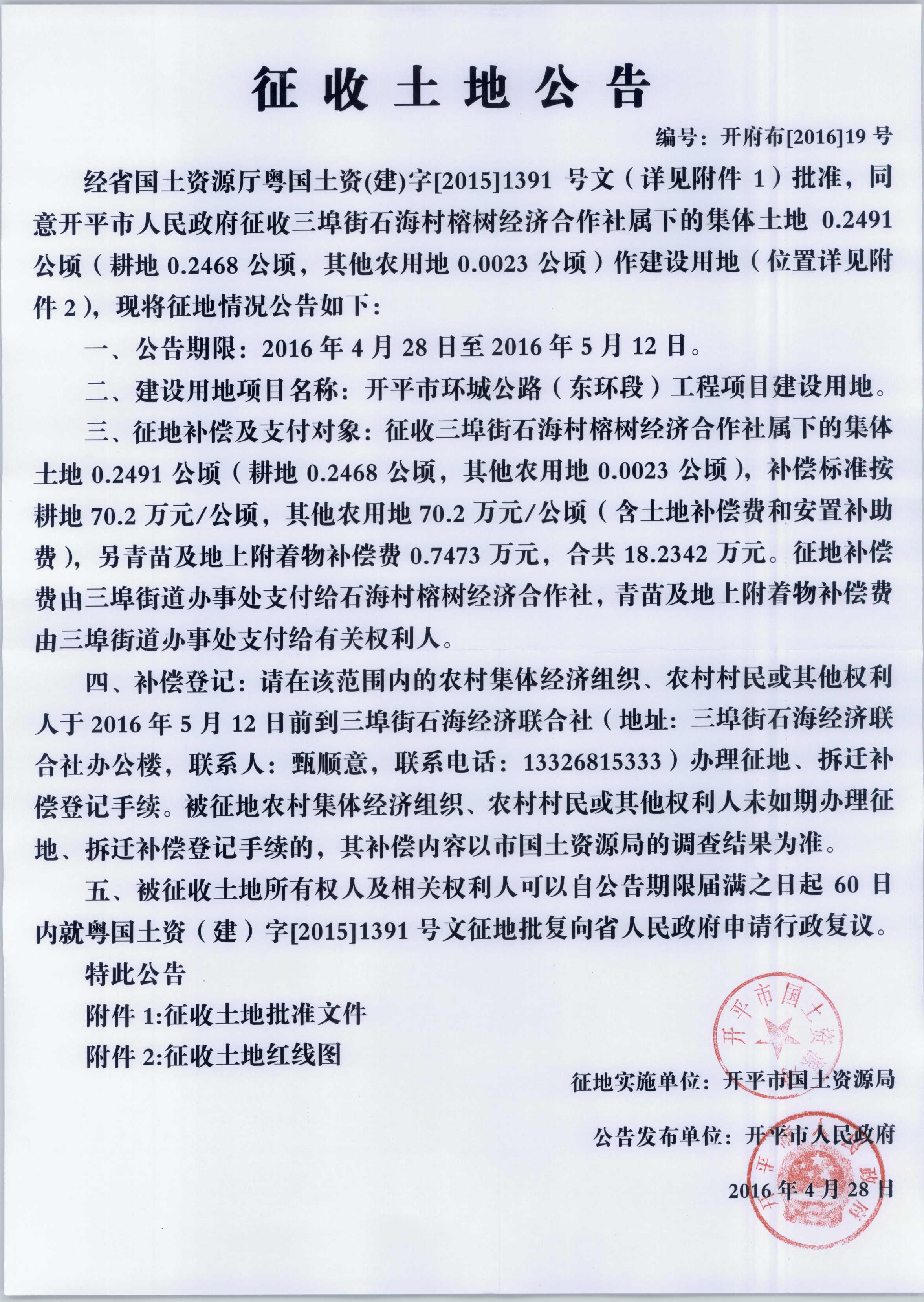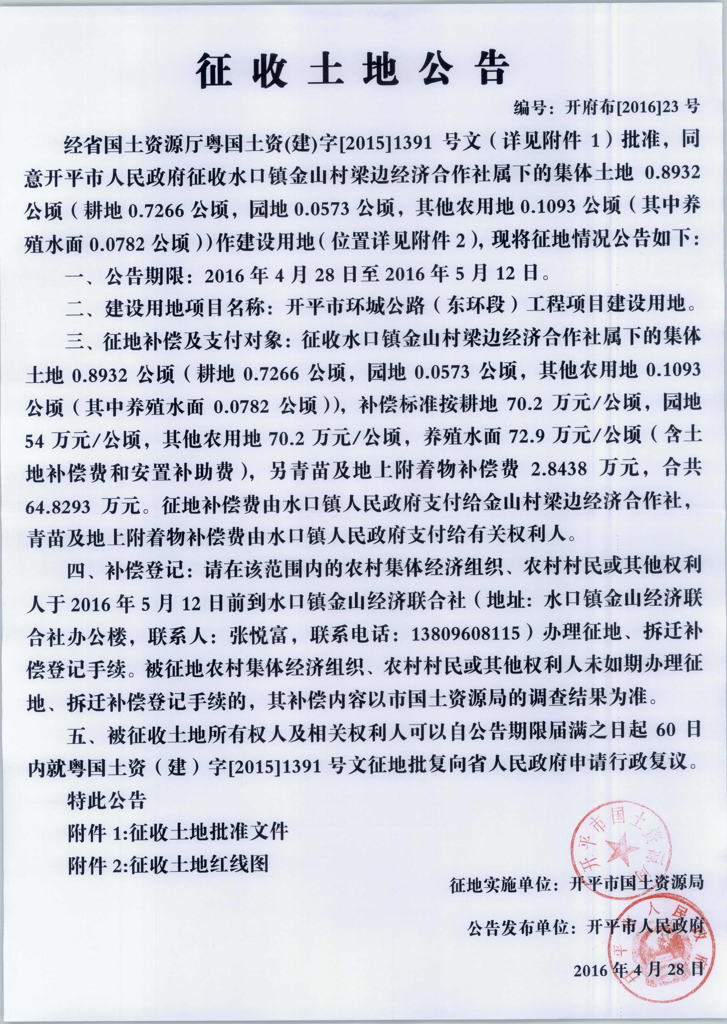 征收土地公告(开平市环城公路(东环段)工程项目建设用地)