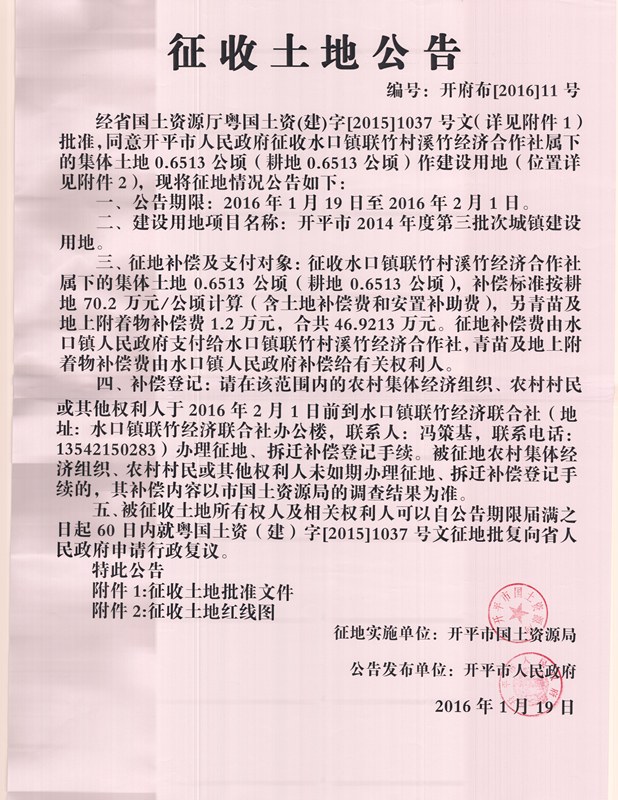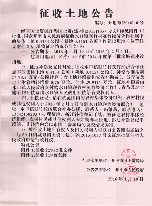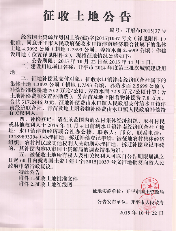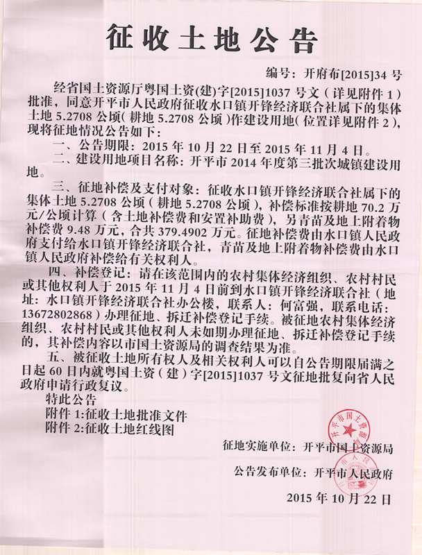 征收土地公告(开平市2014年度第三批次城镇建设用地)
