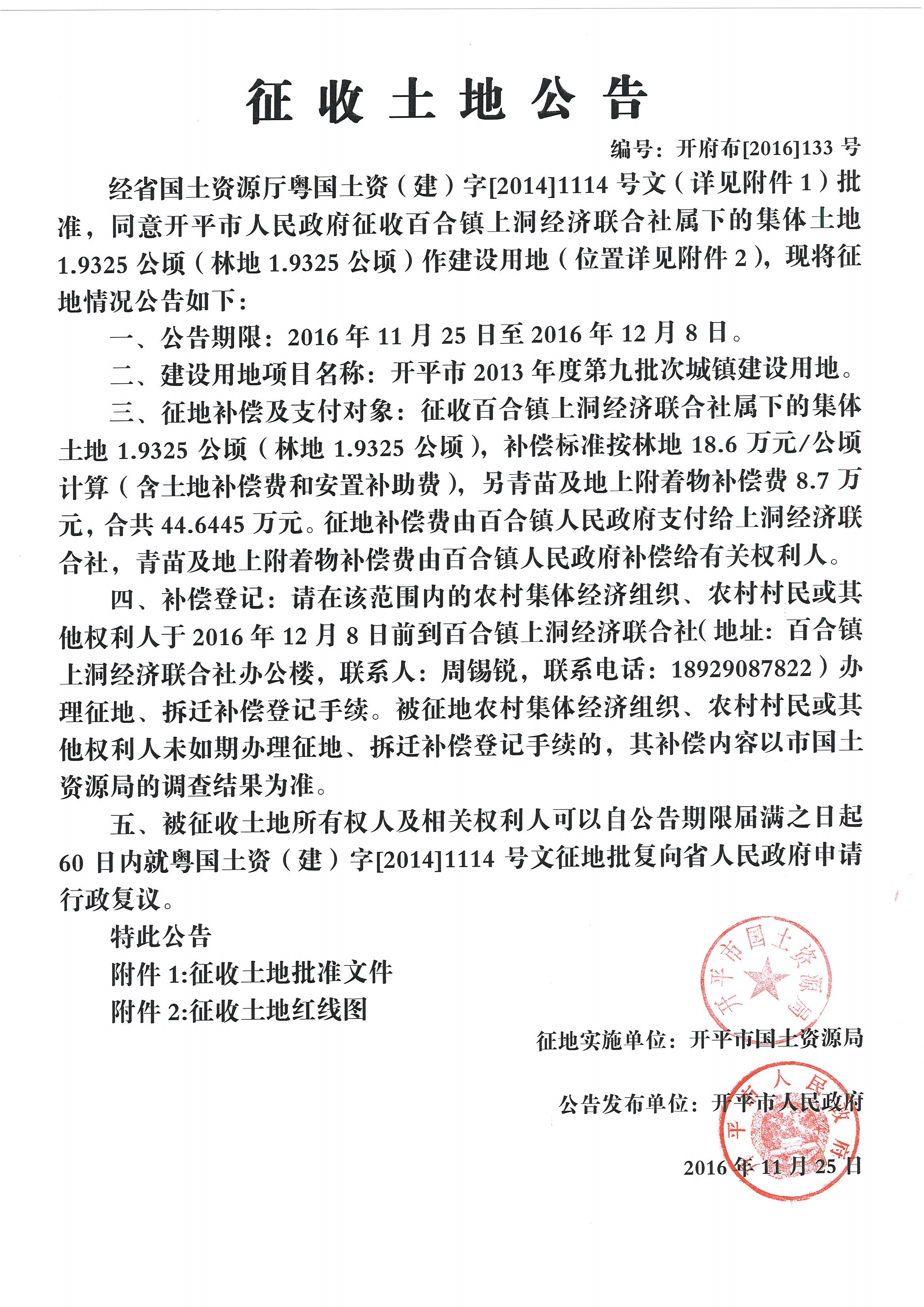 征收土地公告(开平市2013年度第九批次城镇建设用地)