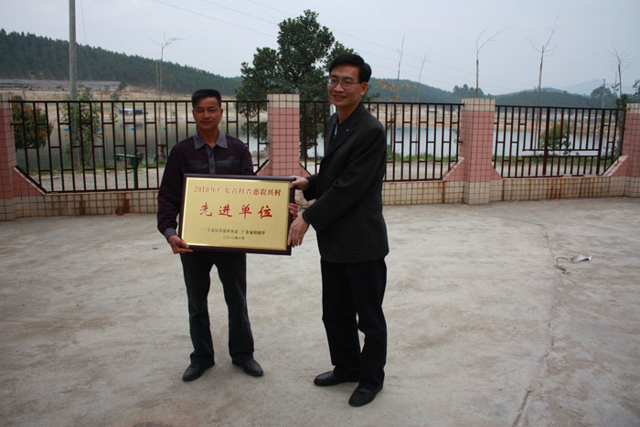 3月31日,开平市科技局的主要领导及相关股室负责人在张如炎局长带领下来到龙胜镇联塘村委会蟠龙综合养殖场,把省科协和省财政厅颁发的“2010年广东省科普惠农兴村先进单位”奖牌授予蟠龙综合养殖场,该养殖场不仅是2010年度江门地区唯一一家获此殊荣的单位,同时也是开平市首获殊荣的科普惠农兴村先进单位。
