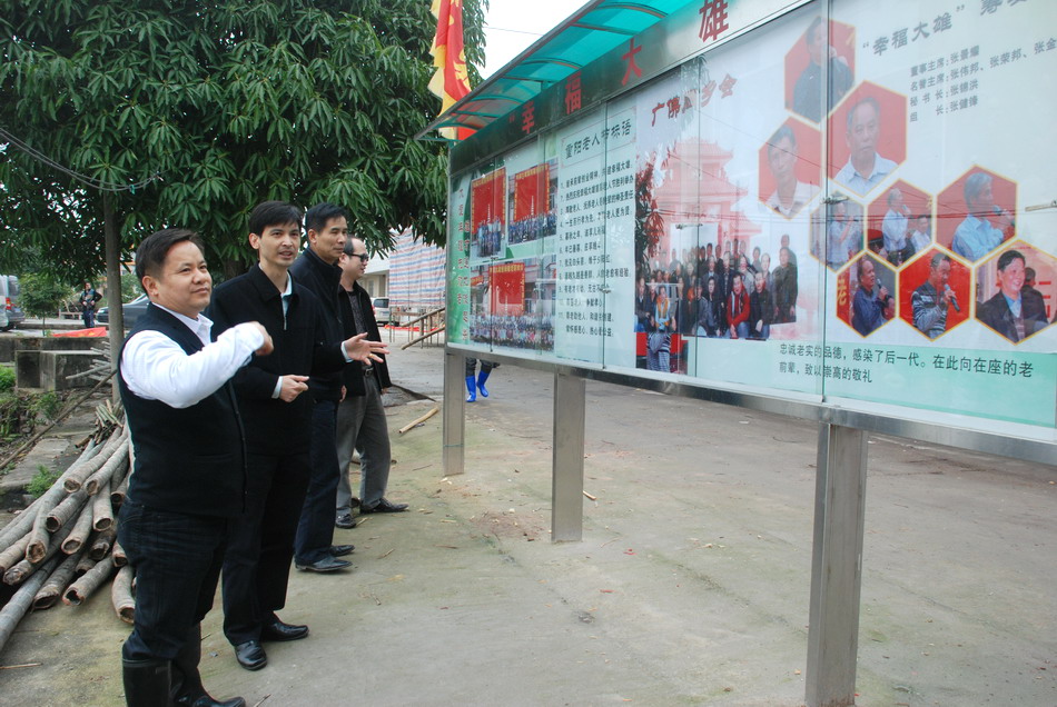 广州天鹰总裁张景耀(左一)陪同市人口计生局副局长谭灼坤(左二)察看大雄宣传栏