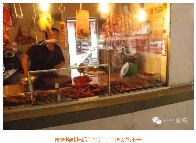 3、烧味档无预进间,虽装有“三防”装置,但管理不到位售卖仓长时间打开,后们亦打开,“三防”形如虚设。