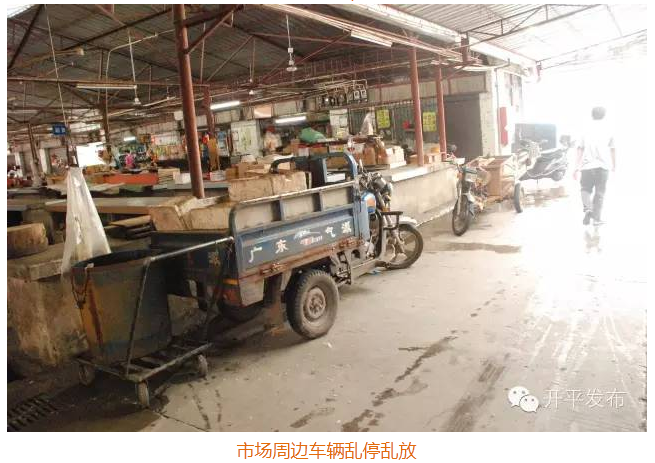 1、市场环境卫生脏、乱、差,占道经营、乱停乱放、没有高台摆卖。