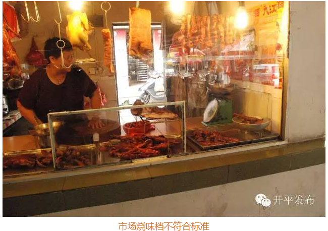 2、烧味档简陋,无“三防”设施、无预进间,绝大部分没有亮证经营,熟食档无“三防”设施。完全不符合省卫生城市标准。