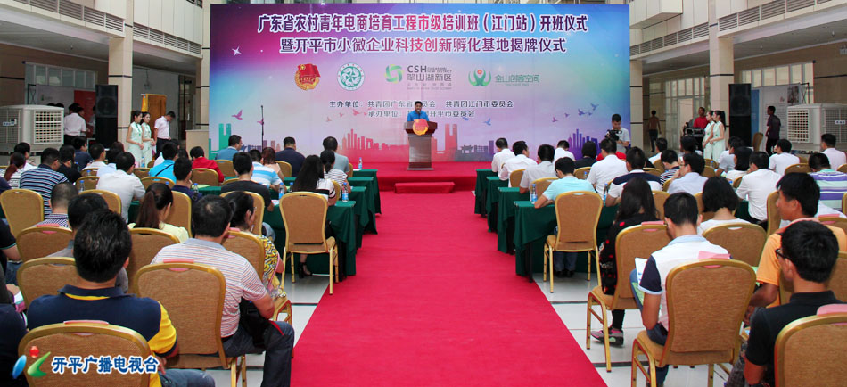 【开平广播电视台 余映意 彭梦乐】10月8日下午,广东省农村青年电商培育工程市级培训班(江门站)暨开平市小微企业科技创新孵化基地揭牌仪式在翠山湖新区举行。团省委副书记梁均达,团江门市委书记郑劲龙,开平市领导余雪俊、李沃华、陈杰文,京东集团华南区副总经理康亮等出席了活动。