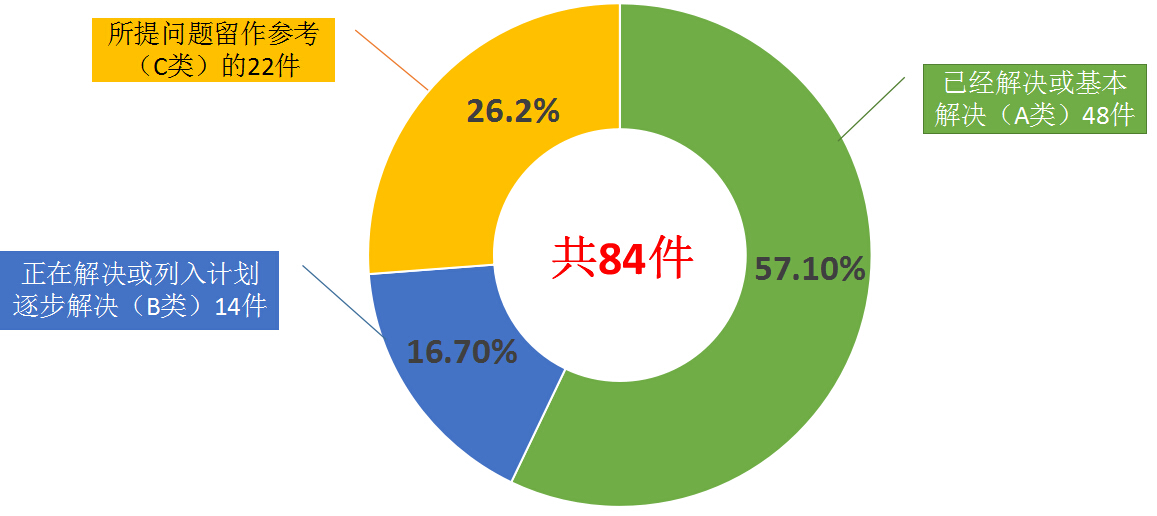 2015年,开平市十五届人大五次会议及闭会期间,政府系统共收到人大代表提出的建议84件,截至2015年9月底,本次建议已全部办理完毕,办复率100%。其中,已经解决或基本解决(A类)的有48件,占总数的57.1%;正在解决或列入计划逐步解决(B类)的14件,占16.7%;所提问题留作参考(C类)的22件,占26.2%。代表对建议办复的满意或基本满意率达到100%。