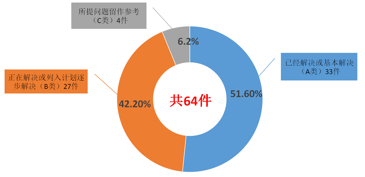 政协开平市十二届六次会议期间,政府系统共收到政协提案64件。截至2015年9月底,本次提案已全部办理完毕,办复率100%。其中已经解决或基本解决(A类)的有33件,占提案总数的51.6%;正在解决或列入计划逐步解决(B类)的27件,占42.2%;所提问题留作参考(C类)的4件,占6.2%。委员对提案办复的满意或基本满意率达到100%。