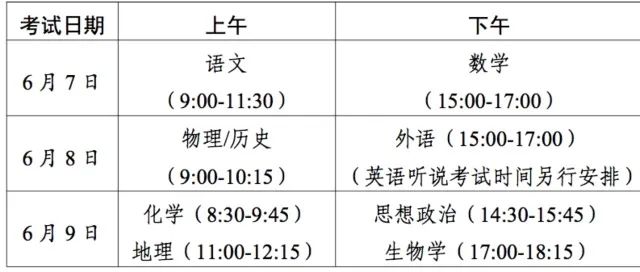 广东省招生委员会明确,今年全国统一高考时间为6月7日-9日。考试科目包括语文、数学、外语3门科目,使用全国卷,由教育部教育考试院统一命题。外语选考语种为英语、俄语、日语、法语、德语、西班牙语中的一种。外语语种为英语的考生,须参加英语听说考试,英语听说考试由广东自主命题、单独举行。
