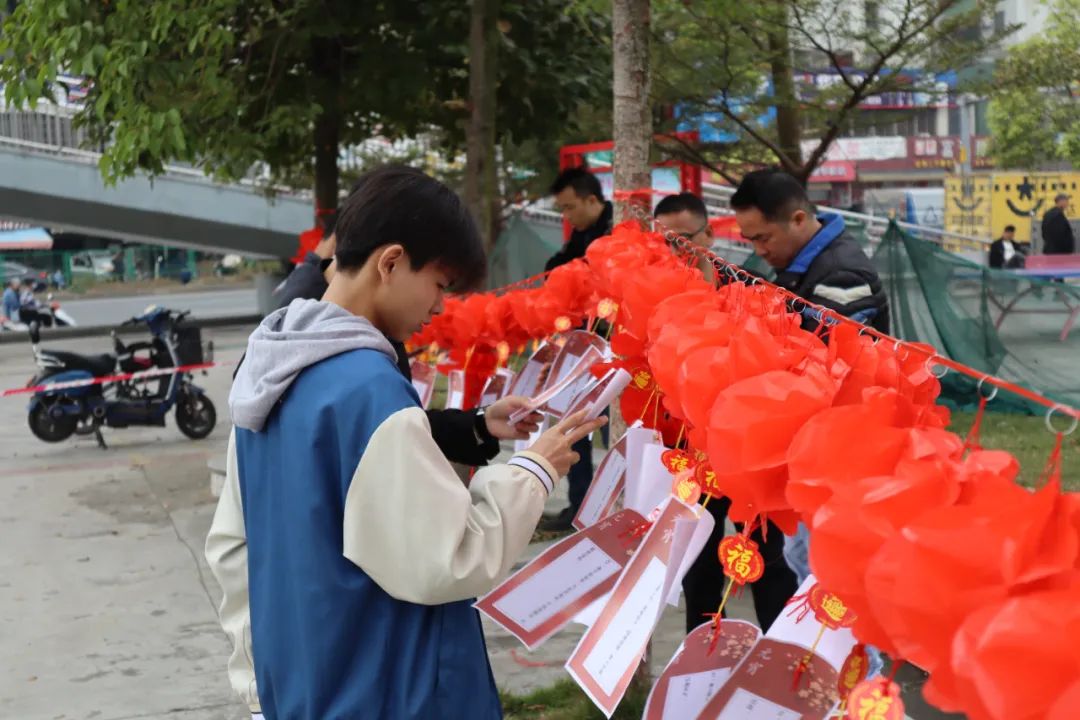 工作人员精心准备了红色花灯和灯谜笺,谜面内容形式多样,不仅包含传统字谜,还涵盖了历史人文、自然科学、文化风俗以及水口特色等多方面知识。