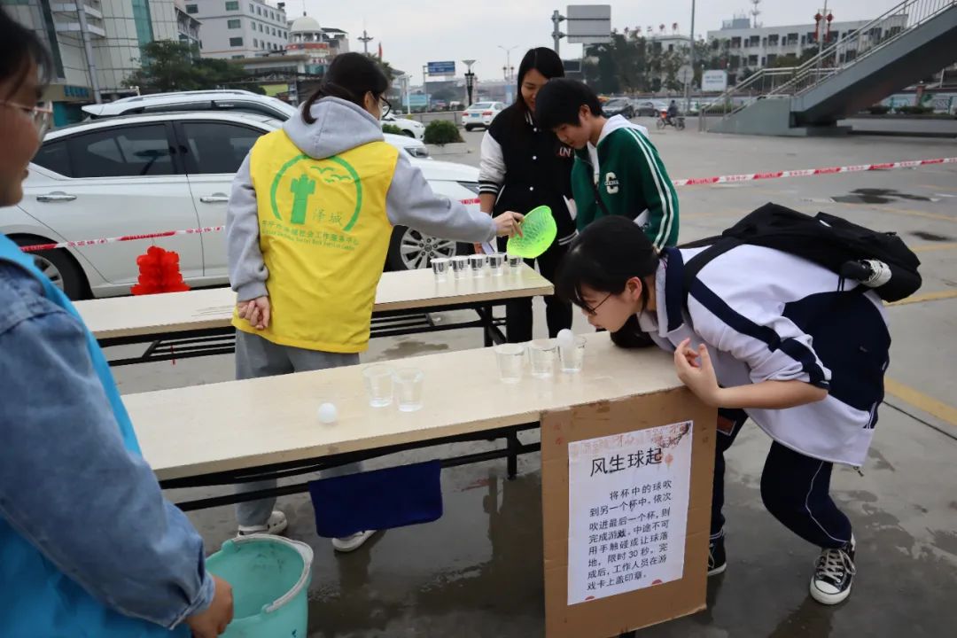 考验“嘴上功夫”的活动,吹乒乓球可是一项技术活。掌握游戏技巧的参赛者,一口气就把乒乓球吹到最后一个杯子里,而未能掌握要领的群众,则使尽全身力气,吹气吹到满脸通红,也不能顺利通关。