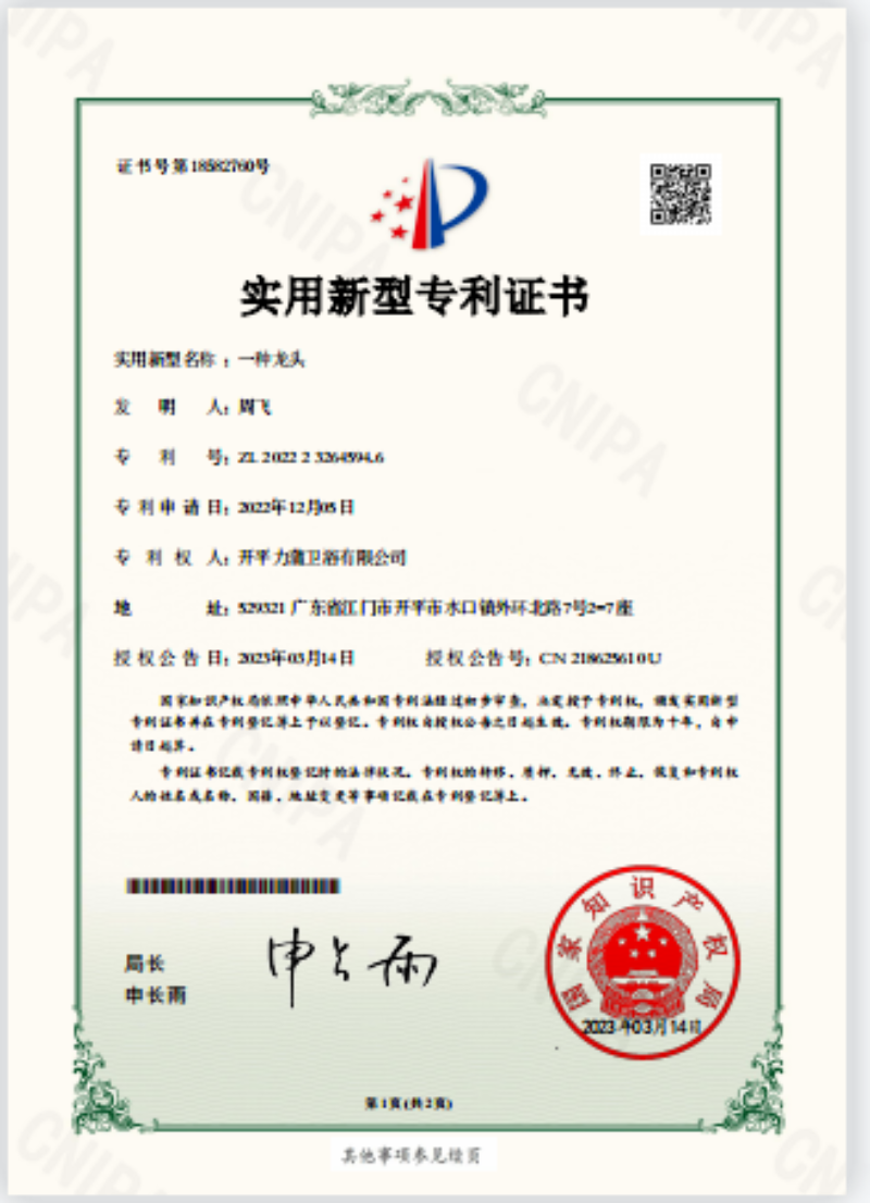 固本强根基,创新求发展。力蒲以“质量为先,科技与管理并举,坚持‘上道工序满足下道工序,竭诚为顾客生产高品质产品’”为发展方向,传承东方智慧,弘扬工匠精神,以精工匠心铸造品质过硬的产品,同时坚持技术创新,顺应行业智能化、高端化的发展趋势,积极开展新产品、新工艺、新设备等研发工作,力蒲分别于2017年和2019年组了“江门市高端卫浴五金制品工程技术研究中心”和“广东省卫浴五金管件工程技术研究中心”以平台管理的方式保障和推动公司技术创新工作。2021年,顺利通过了国家高新技术企业的认定(复审)。2022年,成功被评为省级专精特新中小企业。截至目前,力蒲获得发明专利1项和实用新型专利33项,另有4项发明专利和9项实用新型专利正在申请中,为企业的长远发展积蓄动力。
