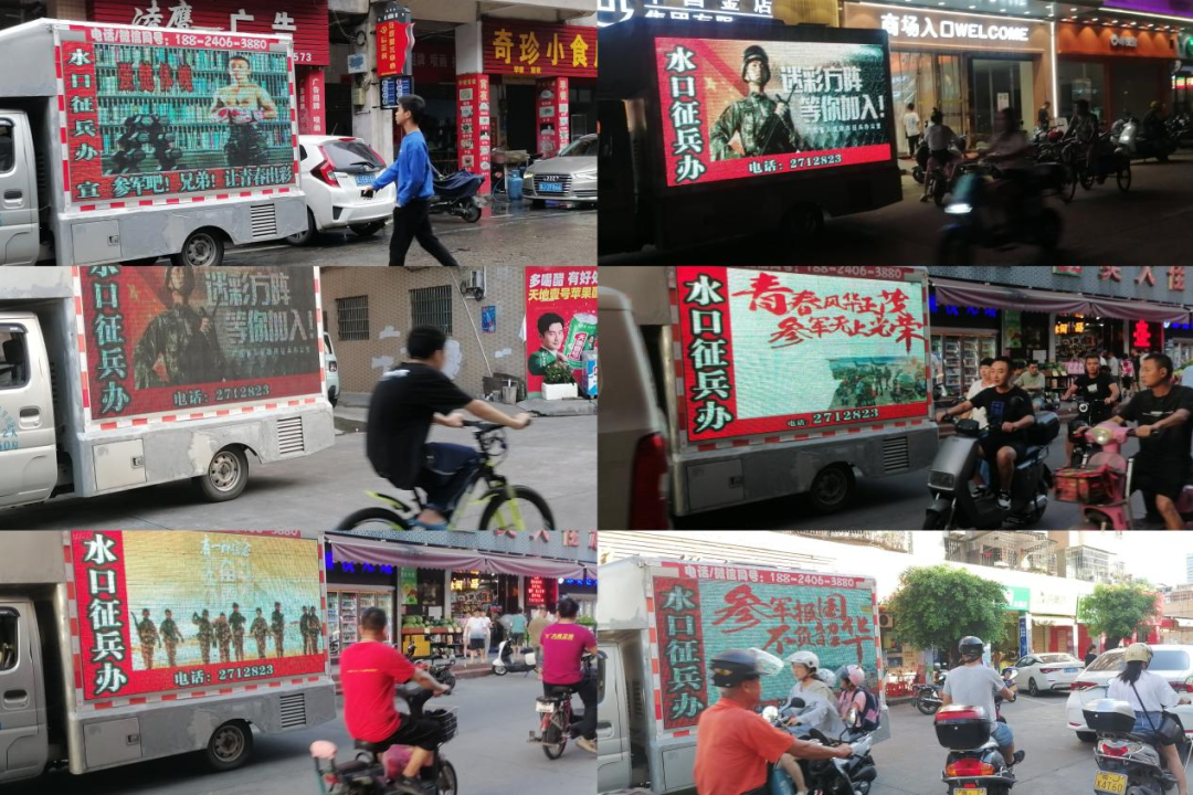 二是充分利用超市、商业街等点位人流量大、位置显著的优势,布置征兵宣传车分阶段开展巡逻式宣传,同时悬挂征兵宣传横幅,通过车载广播和醒目的宣传标语,向过往群众传递着征兵信息,大力营造浓厚的宣传氛围。
