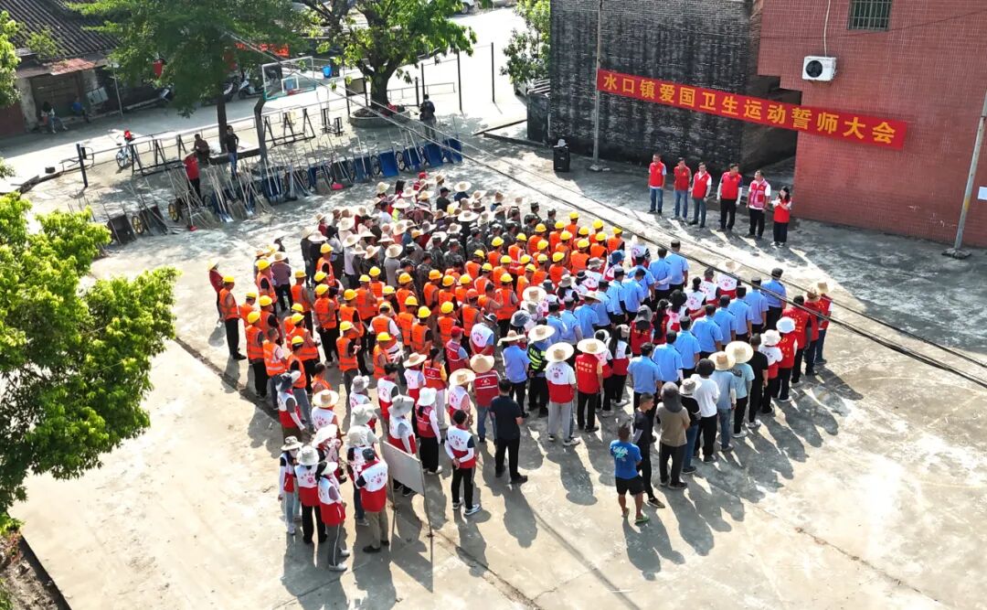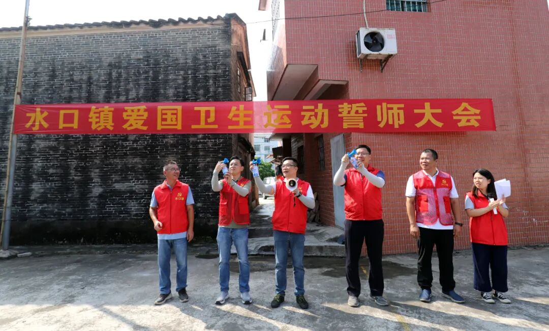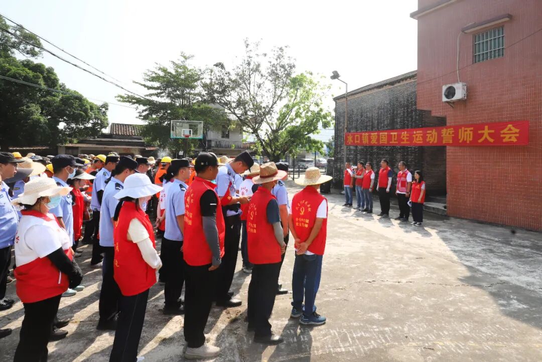 10月17日晚,在镇政府会场,水口镇全体领导班子成员、驻村组负责人、村(社区)书记等80多人参加全镇爱国卫生运动誓师大会,明确“全域动员、全民参与、全力攻坚”的目标任务,建立“党政主导+部门协作+村居响应+全民参与”的全域防控体系,将背街小巷、农贸市场、闲置地块等重点区域整治任务进行分片包干。同时,强调要以“时时放心不下”的责任感,把爱国卫生运动打造成民生工程、民心工程!“我们将发挥专业消杀队作用,加大重点区域消杀频次!”“党员先锋队将带头开展‘敲门行动’,入户清积水,灭蚊虫!”各部门代表依次表态,掷地有声的承诺掀起誓师热潮。