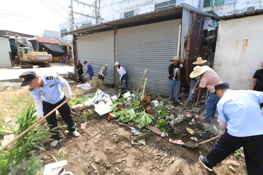 在向阳村,村干部用方言解读爱国卫生运动意义,组建“清扫队”,扛起扫帚向村内卫生死角“宣战”;在人民社区,志愿者与摊主携手清理摊位周边杂物,“齐心灭蚊一小步、城市文明一大步”的标语在市场内格外醒目;在冈中村,党员志愿者兵分两路,一队清理田间灌溉沟渠的杂草淤泥、疏通积水,一队逐户协助村民整理庭院角落、清除蚊媒孳生地,既守护农田生产环境,又改善村民居住条件,赢得群众纷纷点赞。