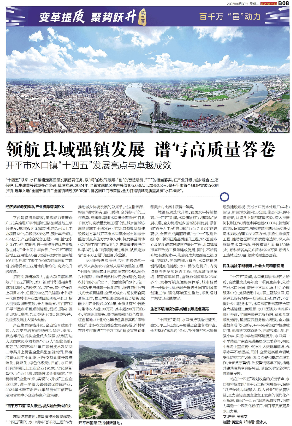 近日,南方都市报整版刊发《开平市水口镇:领航县域强镇发展 谱写高质量答卷》,从“百千万工程”、经济发展、生态环境、民生福祉等多维度,全面展示了水口镇在“十四五”期间经济社会各项事业发展取得的丰硕成果,为加速推动水口打造成为宜居宜业宜工宜商的现代化产业新城、实现“十五五”良好开局汇聚磅礴力量。现将全文转载如下:
