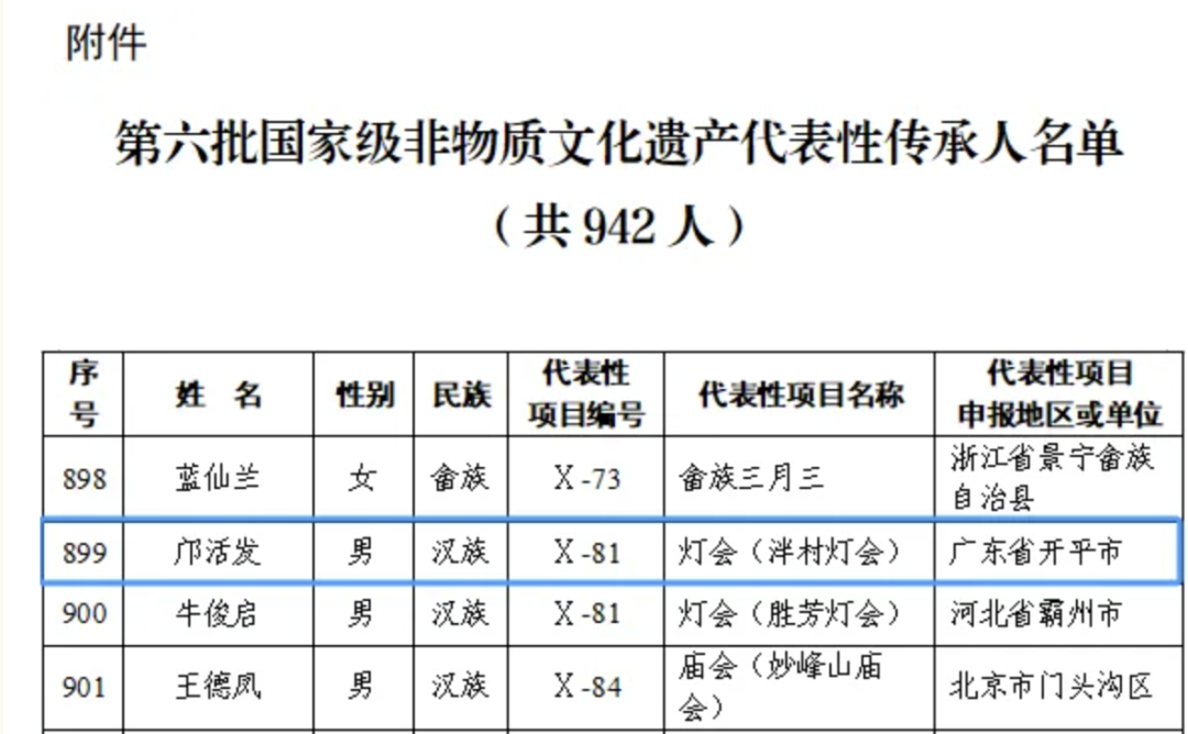 文化和旅游部官网发布《文化和旅游部关于公布第六批国家级非物质文化遗产代表性传承人的通知》。泮村灯会代表性传承人邝活发成功入选为第六批国家级非遗代表性传承人。