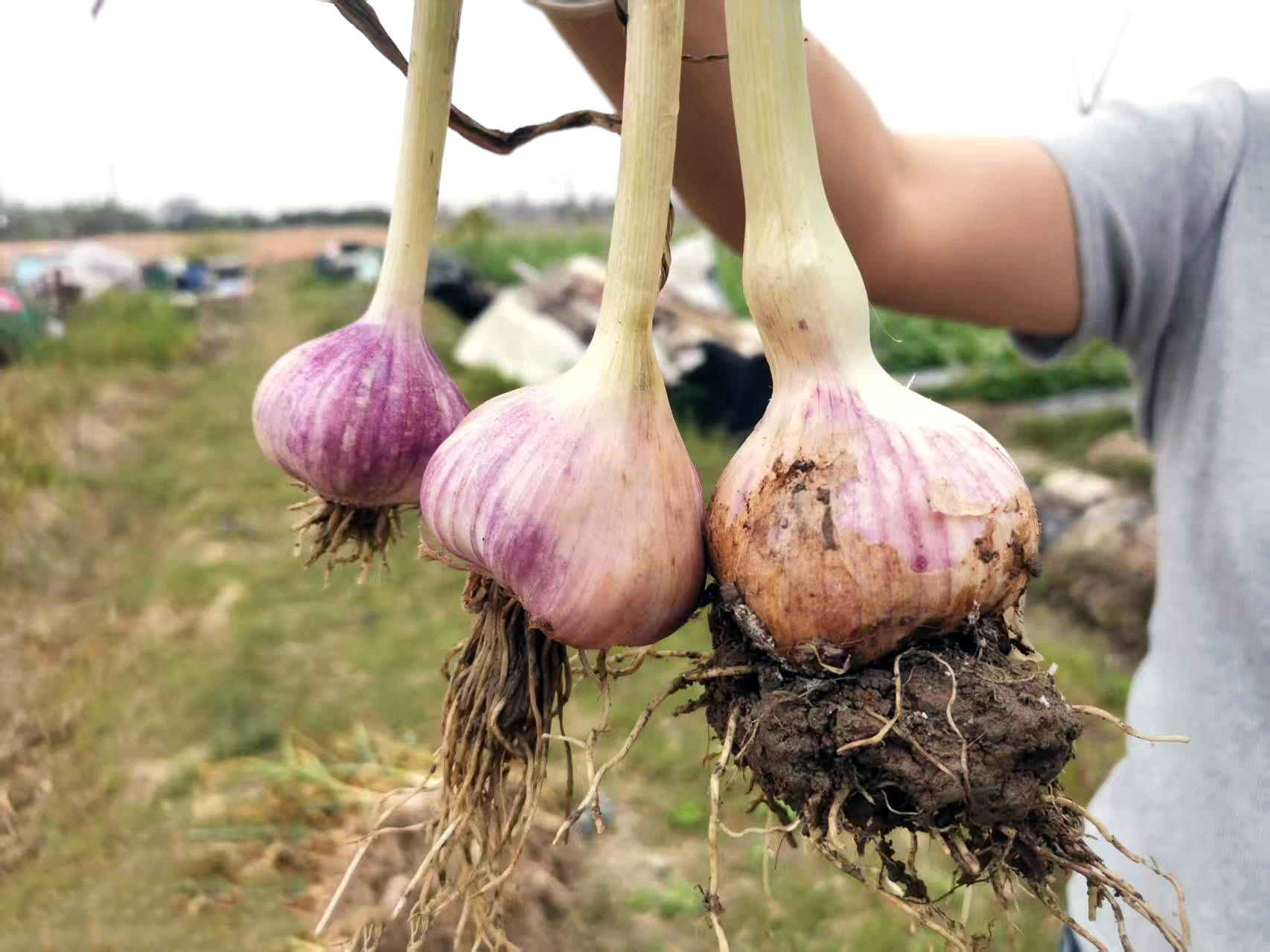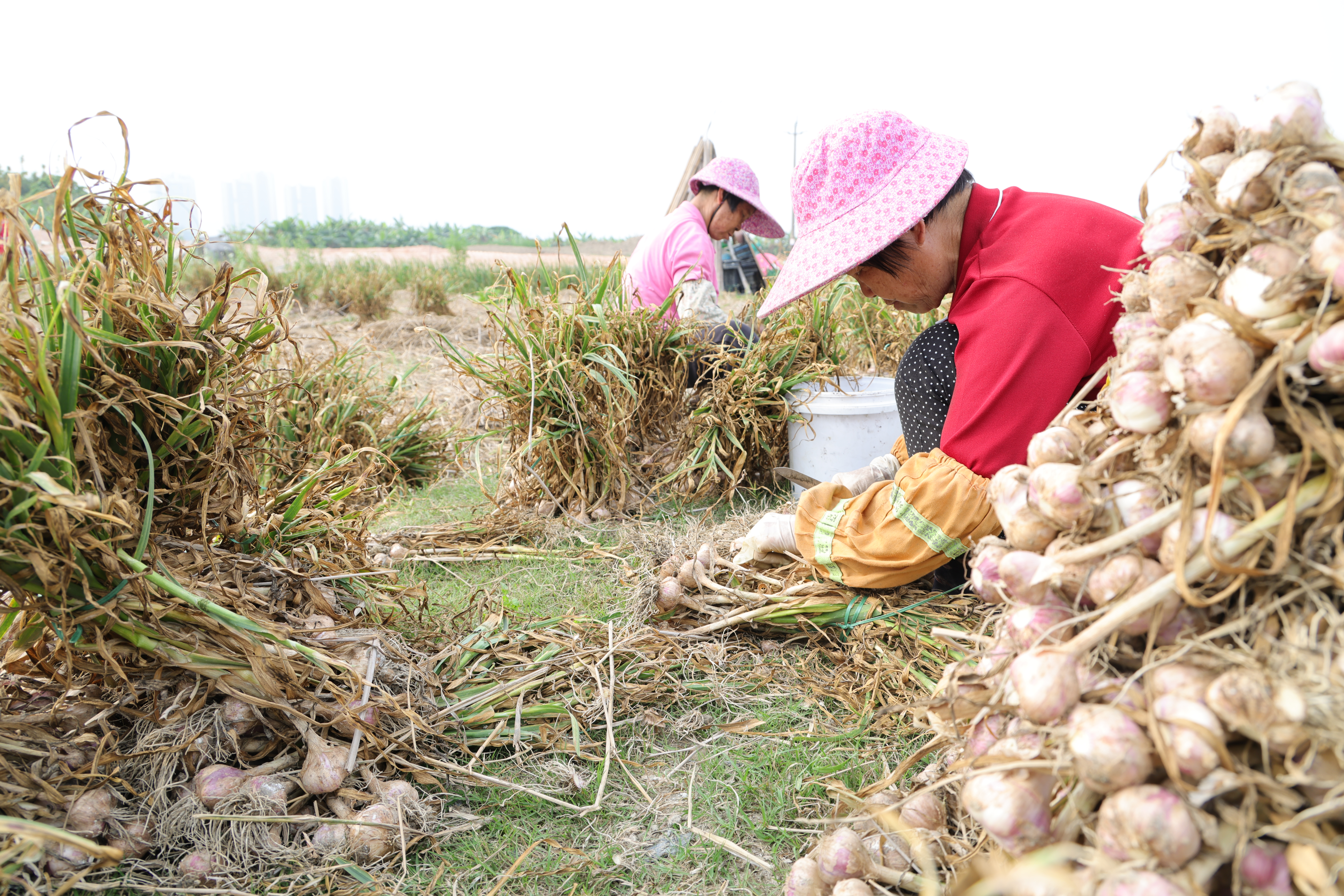 金山村的蒜田里,村民们熟练地挖蒜、剪蒜、辫蒜,一派繁忙的丰收景象;火蒜蒜头圆大、蒜膜紫红,煞是喜人。
