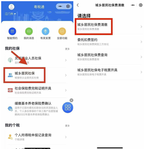 3. 通过“粤税通”小程序,在【我的社保】选择【城乡居民社保】,点击【城乡居民社保费清缴】使用进行缴费。