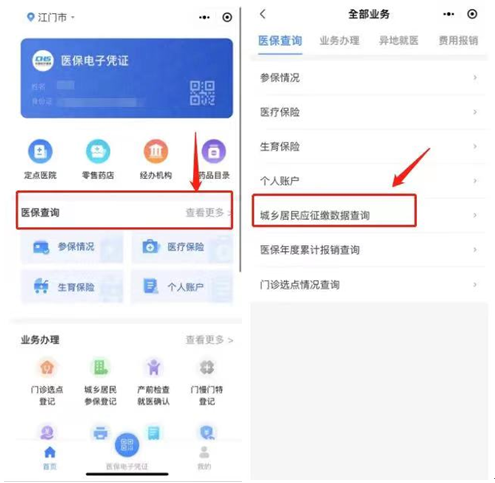 已办理参保登记的参保人可登录“粤医保”小程序,在【医保查询】模块中点击【城乡居民应征缴数据查询】,查询本人城乡居民医保应征缴数据。