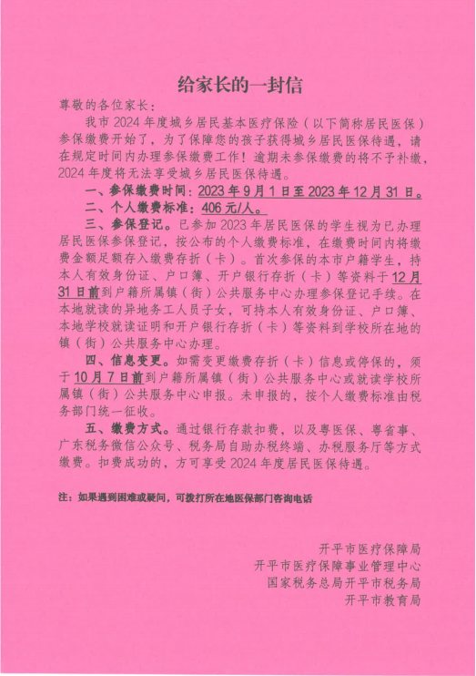 我市各院校(中小学、幼儿园、托儿所)就读的学生家长,请仔细阅读《给家长的一封信》,为您的孩子及时办理参保登记手续,确保孩子的城乡居民医保待遇。
