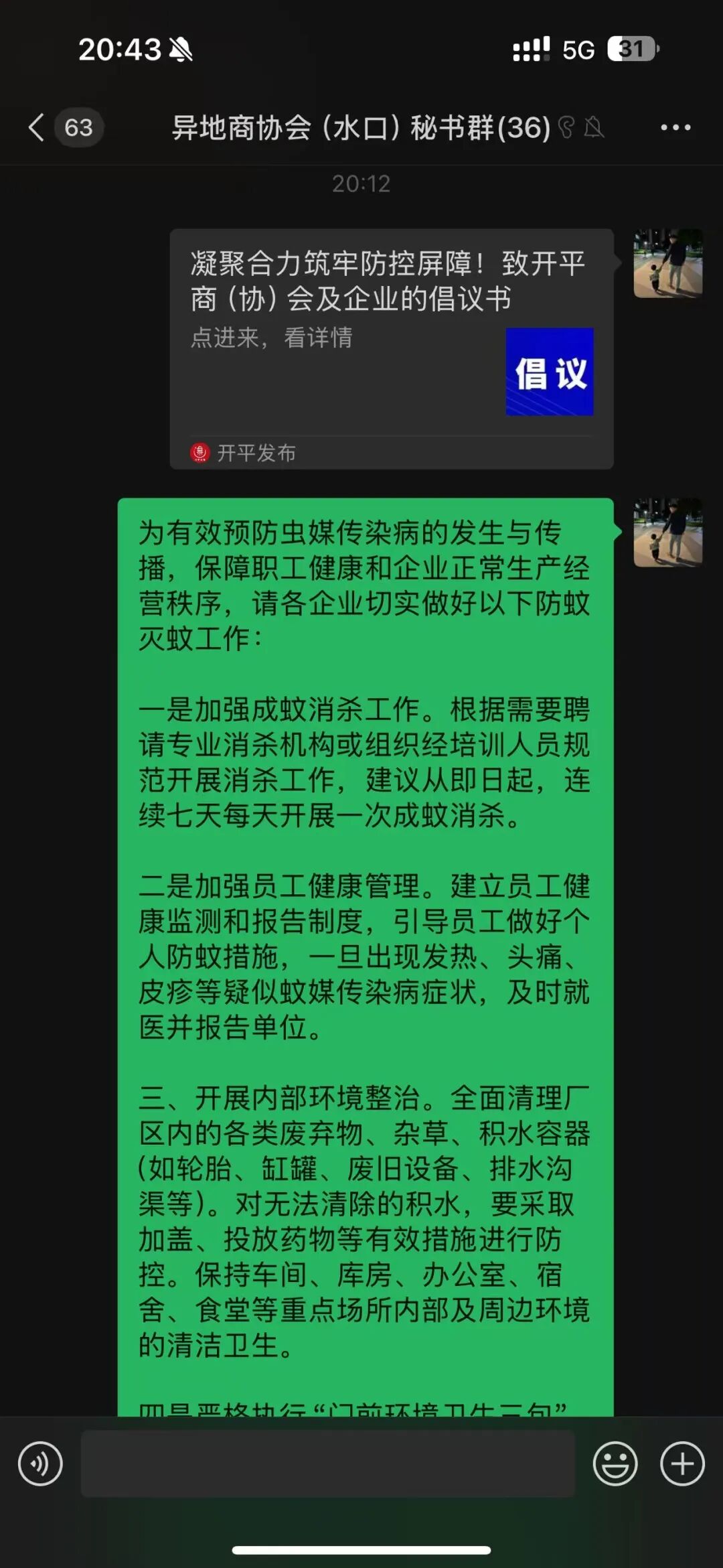 当前,全市正处于防控基孔肯雅热疫情的关键时期。为凝聚政企同心抗疫合力,筑牢企业疫情防控防线,保障人民群众身体健康,在水口镇党委、政府的倡议号召下,水口镇“两新”党组织和党员、各商(协)会迅速响应、冲锋在前,踊跃投入到疫情防控工作中,多措并举筑牢蚊媒防控屏障,以实际行动彰显责任与担当。