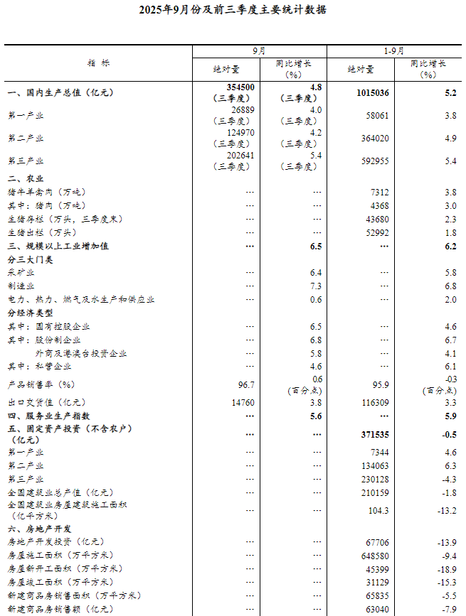 前三季度,全国固定资产投资(不含农户)371535亿元,同比下降0.5%;扣除房地产开发投资,全国固定资产投资增长3.0%。分领域看,基础设施投资同比增长1.1%,制造业投资增长4.0%,房地产开发投资下降13.9%。全国新建商品房销售面积65835万平方米,同比下降5.5%;新建商品房销售额63040亿元,下降7.9%。分产业看,第一产业投资同比增长4.6%,第二产业投资增长6.3%,第三产业投资下降4.3%。民间投资同比下降3.1%;扣除房地产开发投资,民间投资增长2.1%。高技术产业中,信息服务业,航空、航天器及设备制造业,计算机及办公设备制造业投资同比分别增长33.1%、20.6%、7.4%。9月份,固定资产投资(不含农户)环比下降0.07%。