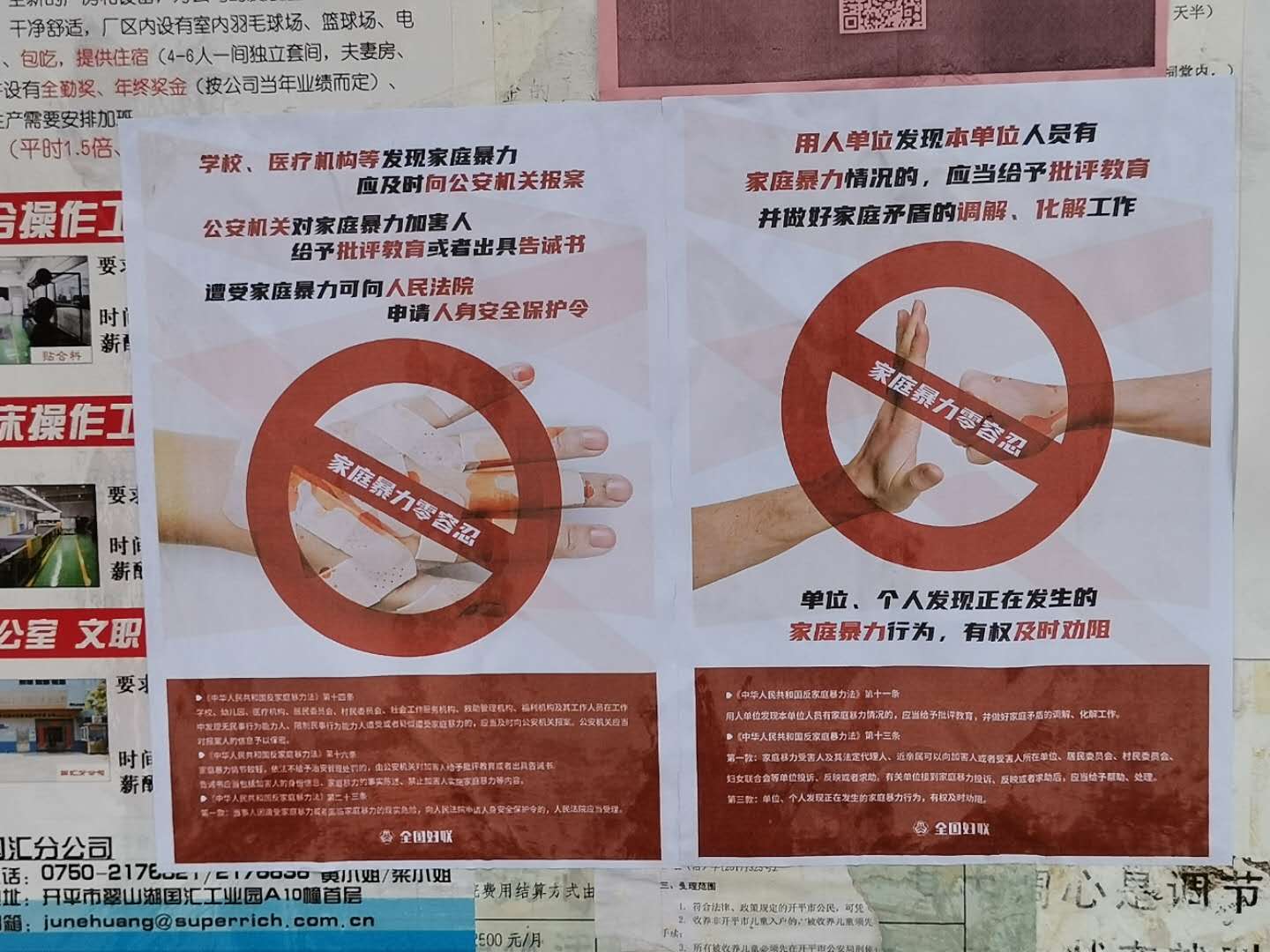一、张贴反家暴宣传海报。通过在镇村两级公共橱窗、宣传栏等广泛张贴反家暴宣传海报,引导用人单位、学校、医疗机构、个人等社会力量积极发挥作用,反对家庭暴力,全力守护妇女生命健康安全。