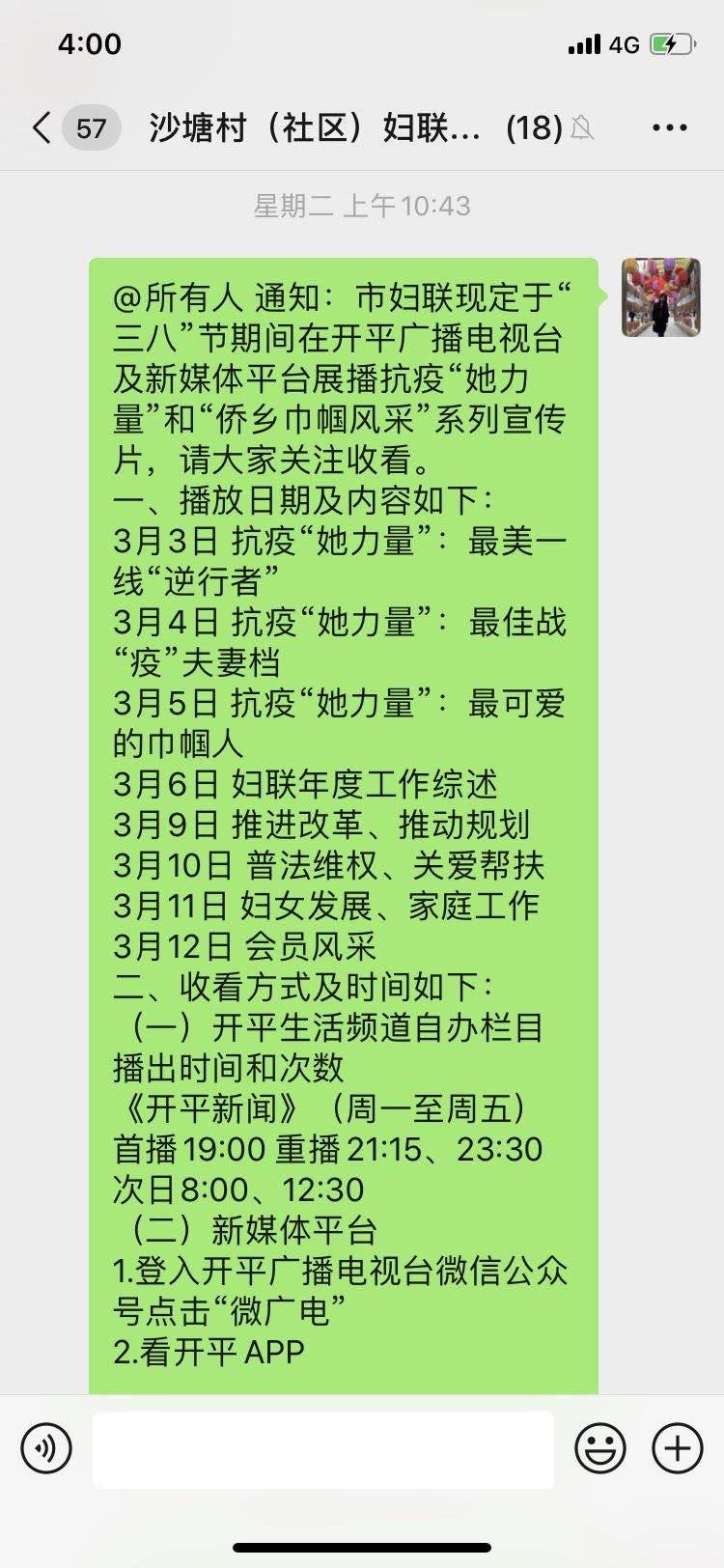 三、组织观看学习先进妇女事迹。在落实“足不出户”为疫情防控添助力的前提下,镇村妇联组织通过手机微信,广泛发动辖区群众收看市妇联在开平广播电视台及新媒体平台展播的抗疫“她力量”、“侨乡巾帼风采”系列宣传片,传递我市巾帼助力疫情防控的正能量,让群众深入了解我市妇女发展、妇女维权、关爱帮扶等妇女工作。