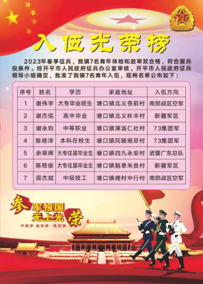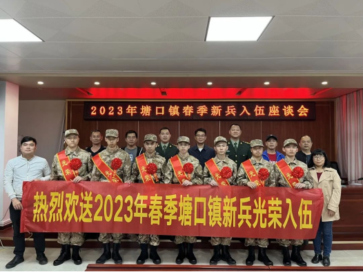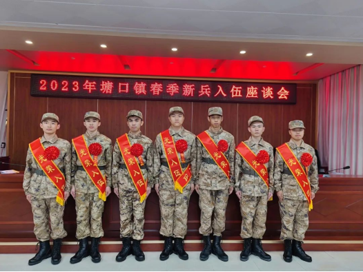 3月14日下午,塘口镇在开平市人武部欢送7名入伍新兵,和入伍新兵进行座谈,激励他们不忘初心、建功军营。塘口镇党委副书记、镇长罗发荣,镇党委委员、武装部部长陈海以及新兵所属村(社区)党支部书记参加活动。 座谈会上, 7名预定新兵身披绶带、胸配红花, 精神抖擞, 带着家乡父老的殷切期望和美好祝福, 即将踏上保家卫国新征程! 座谈会上,塘口镇党委委员,武装部部长陈海首先对光荣入伍的新兵表示热烈祝贺,并详细讲解了入伍之后相关注意事项。各村(社区)党支部书记分别向入伍新兵作欢送寄语。 入伍新兵纷纷表示,对加入军营深感荣幸和自豪,入伍后将以部队为家,服从命令、严守纪律,刻苦训练、不负青春,争做一名优秀的人民子弟兵。 塘口镇党委副书记、镇长罗发荣代表塘口镇党委、镇政府向即将踏上军营的预定新兵表示热烈的祝贺。他对新兵们提出四点希冀:一要树立从军报国的理想;二要有吃苦的思想准备;三要苦练军事本领,做一名合格军人;四要积极向上,早日成长成材。最后他希望预定新兵同志珍惜部队生活的有限时间,内强素质,外塑形象,在部队好好锻炼成才,争取更多荣誉,也为家乡增光添彩。 一身戎装,一面担当; 一股军魂,一生信仰。 祝贺这7位优秀的塘口青年~ 希望你们在部队苦练本领意志, 不忘初心,建功争光, 也热切期盼你们退伍复员后 回到家乡塘口继续建功立业!