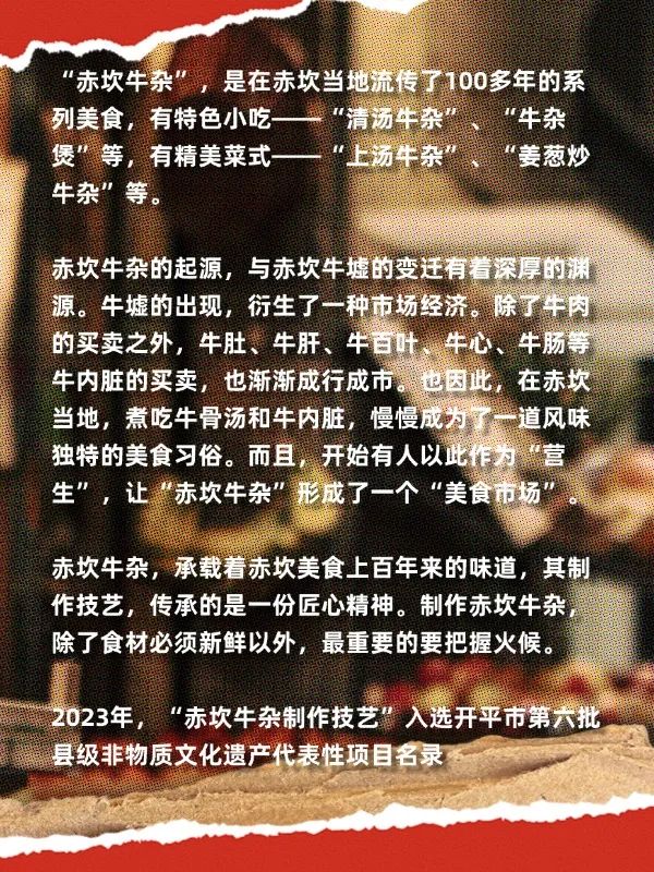2023年,“赤坎牛杂制作技艺”入选开平市第六批县级非物质文化遗产代表性项目名录。